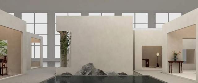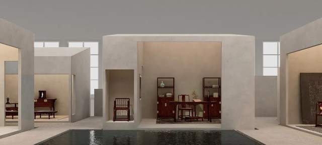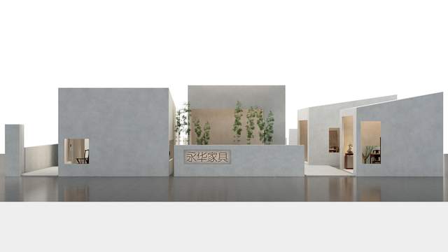 永华家具整体展区面积将近400平方米,“几”字空间形态,茶室、客厅、书房、禅室、会客室及琴室六个主题空间,以水池为中心,散点式分布。