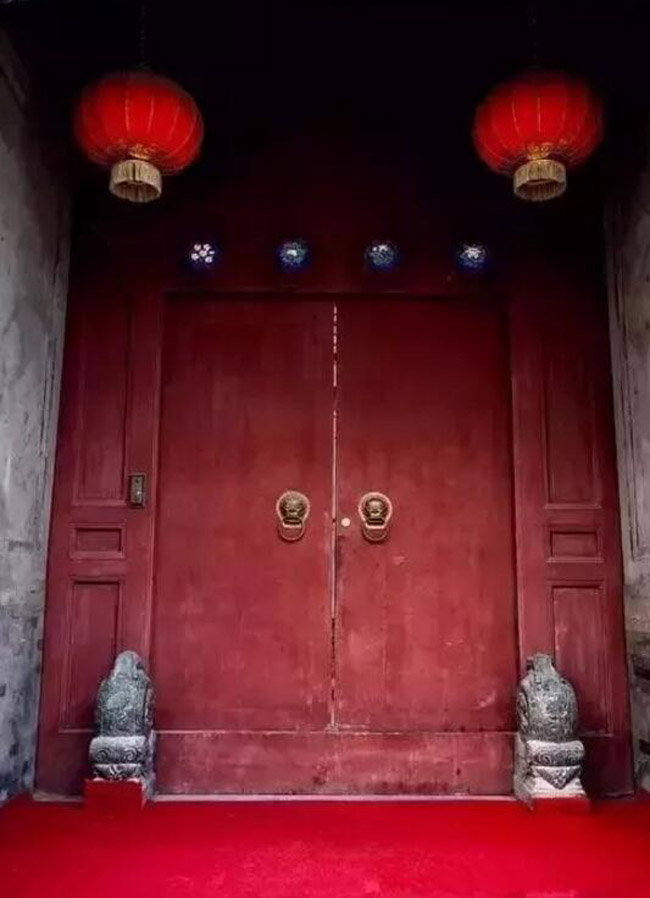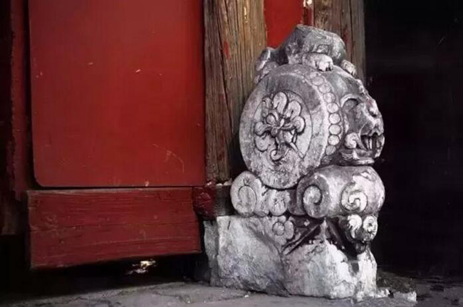狮子型和石虎型的门墩儿,是过去四合院门前最常的。“狮”和“世”谐音,九只狮子是“九世同居”,表示合家团聚、同堂和睦的祝愿。 有权有势的大户人家讲究在门前摆上一对汉白玉雕的大石狮子,通常是雄狮居左,右爪下踩着绣球,被称为“狮子滚绣球”;雌狮居右,左爪下是一只幼狮,叫做“少师少帅”,意思是子嗣昌盛,世代高官。而大多数的四合院是在门框两侧放置一对小石狮子或小石虎门墩儿,或蹲或站,或伏或仰,犹如一对保护神,看守宅门。