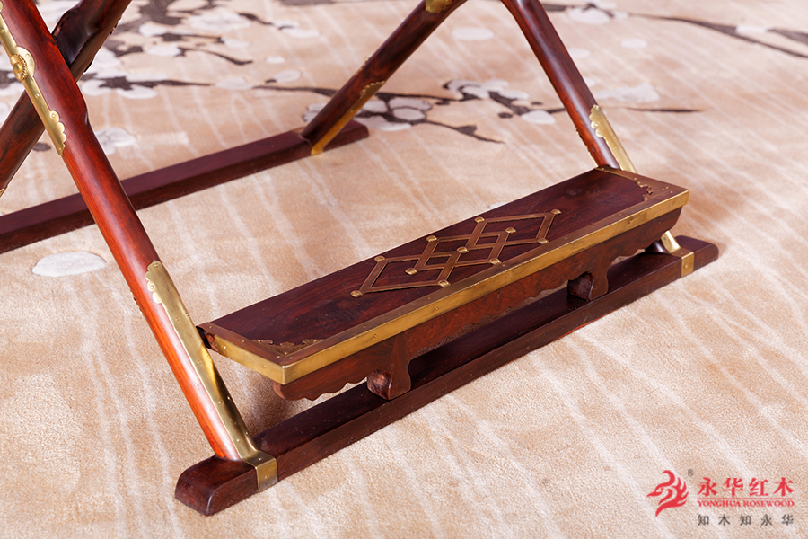 两侧“鹅头枨”亭亭玉立,典雅而气。在扶手、靠背、踏板上,配制牙子,在交接之处用铜装饰件包裹镶嵌,不仅起到坚固作用,更具有点缀美化功能。