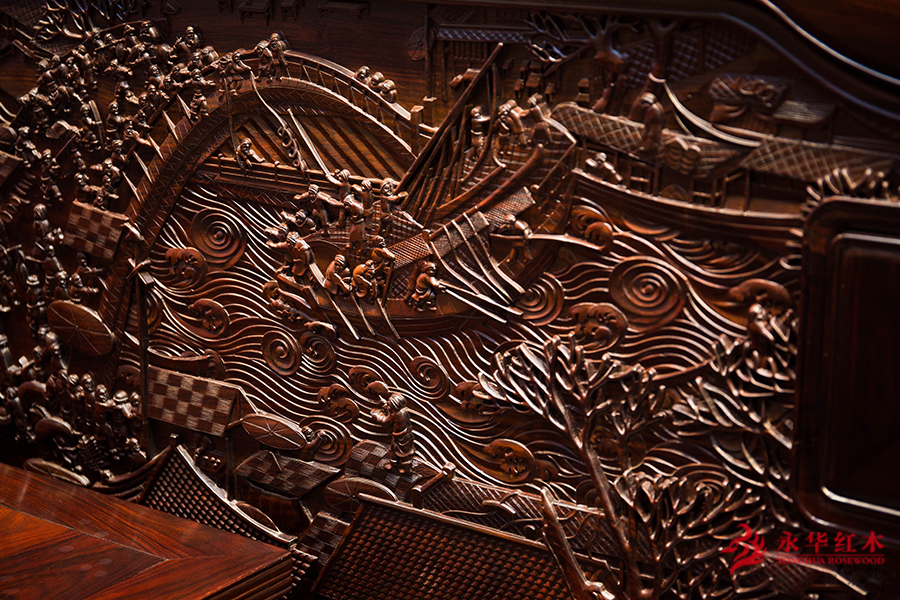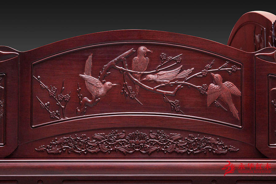 在中国古典红木家具上所呈现的雕刻受中国书法和绘画的影响甚深,尤其是中国绘画,它给中国古典红木家具的雕刻提供了无限的题材和传神的境界。