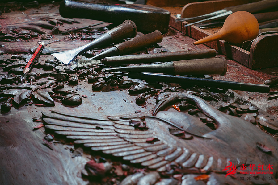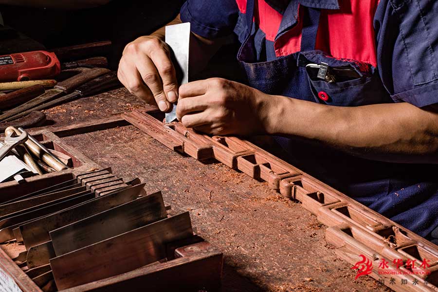 传统红木家具最令人赞叹的是卓越超群的手工技艺。锯、刨、刮、雕、凿、锉、等一系列的手工工序,浸入匠人的汗水与严谨,是机械无法取代的匠心,成就了红木家具的实用功能和审美功能,表现出了红木家具作为物质产品的文化性和艺术性。