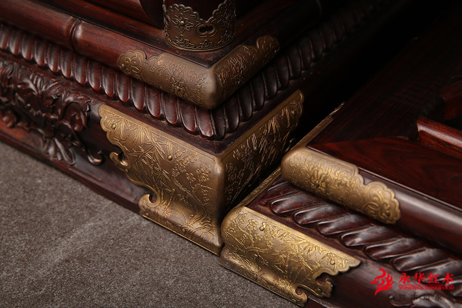 红木家具的铜活儿是家具表面使用的一些金属构件,起到必要的连接、活动、紧固、装饰等功能。不同模块的铜活在铜锁的连接下成为一个完整体,同时还具有不可替代的实用功效。铜活就像是为红木家具搭配的“首饰”,而作为艺术精品的“首饰”,无论是选材还是工艺上可是半点都不能马虎的。