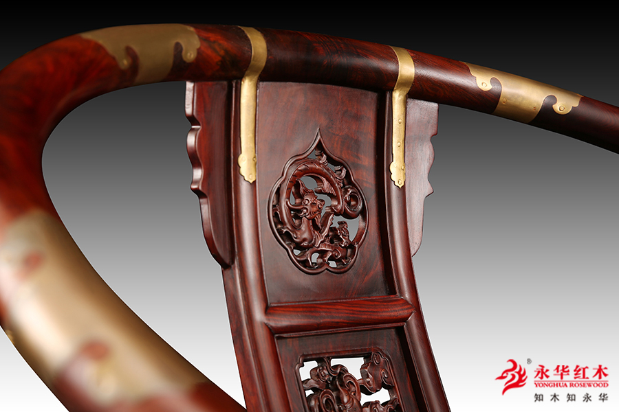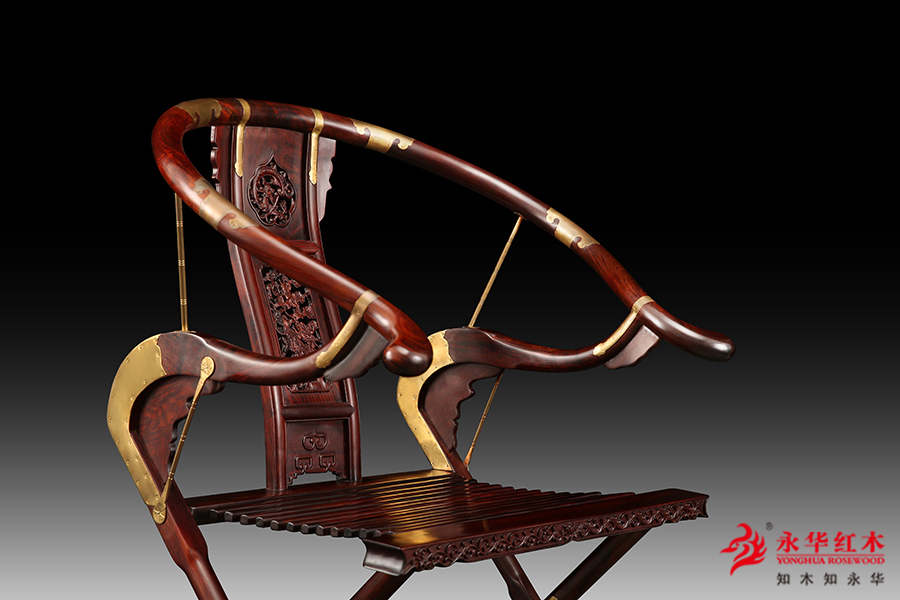 “交椅”,是红木家具中使用铜活最多的一种家具,由于其结构上多弯转起承,为保证其承重的安全需要,这就需要铜活来担当起重任。“交椅”上的铜活不仅在弯转处起支撑作用,而且要在接榫处采用铜叶片包裹起到加固作用。这些铜活工艺要求特殊,如果安装不得当或不重视,都会造成家具在品相甚至是结构上出现瑕疵。