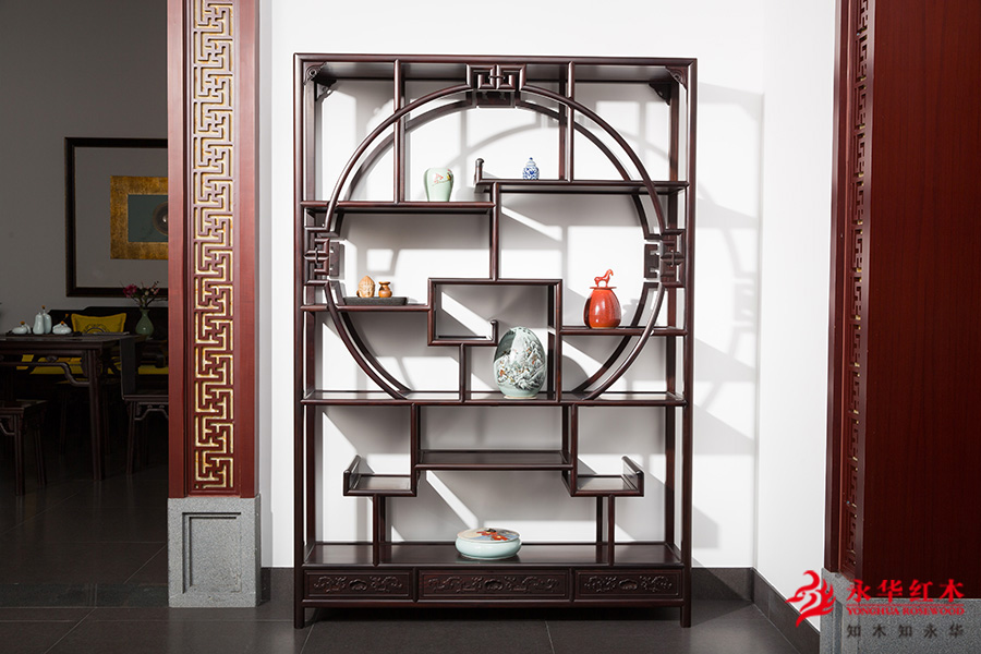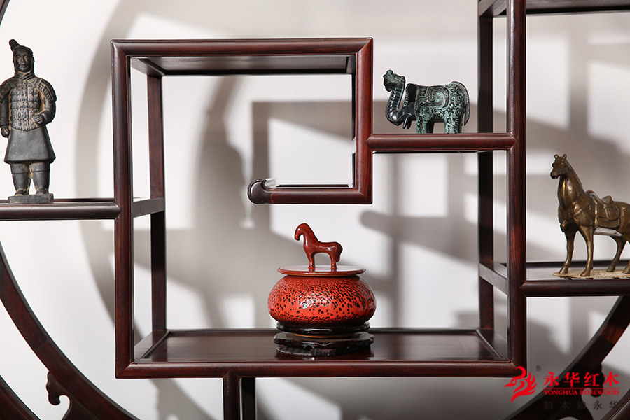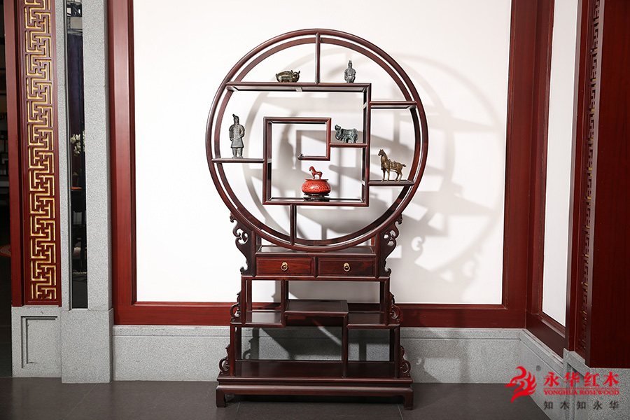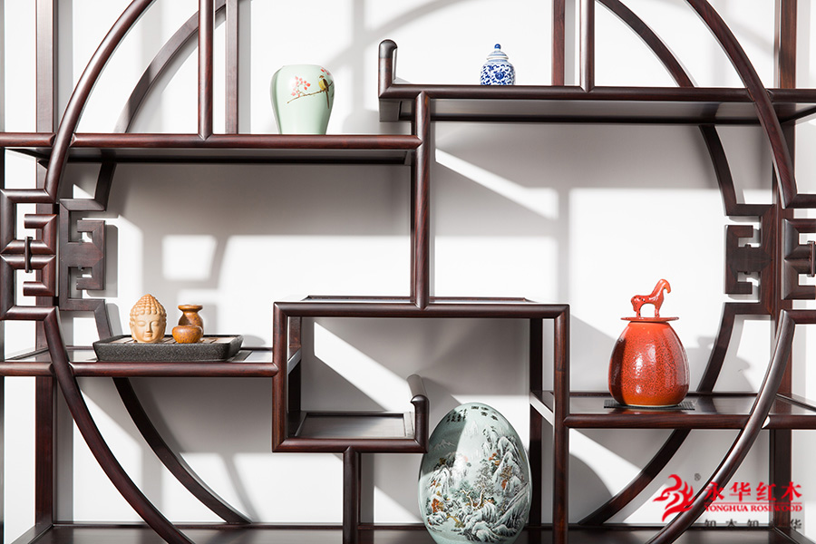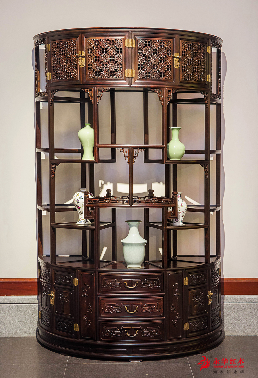 摩天轮式博古架,前后相通。圆形不仅使外观上更加圆润,也蕴含着国人讲求的团圆之意。通过对局部细节的雕刻和装饰,让博古架更加大方、沉稳。