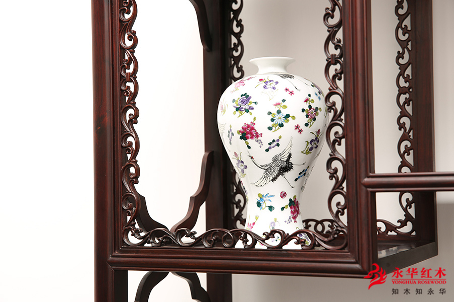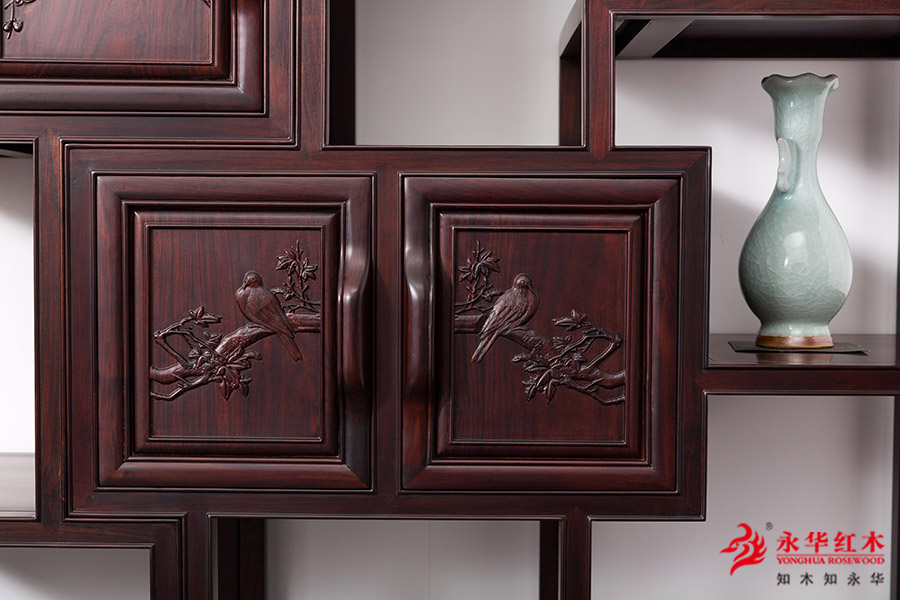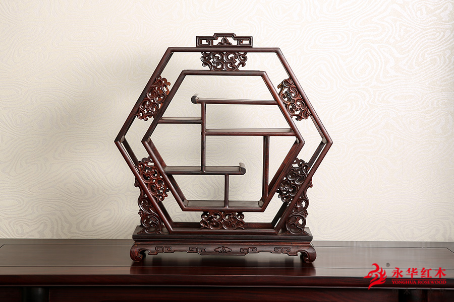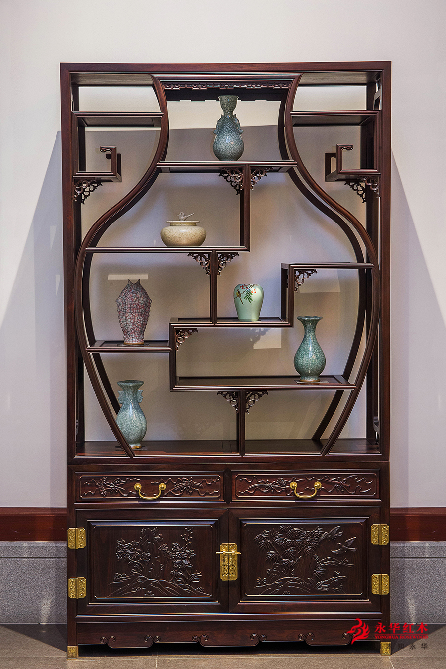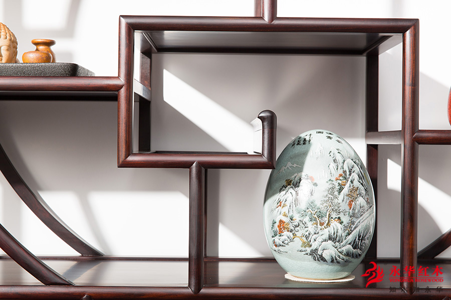 摩天轮式博古架,前后相通。圆形不仅使外观上更加圆润,也蕴含着国人讲求的团圆之意。通过对局部细节的雕刻和装饰,让博古架更加大方、沉稳。