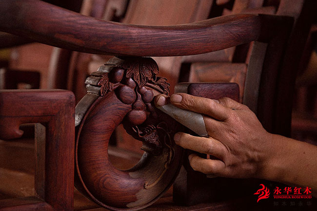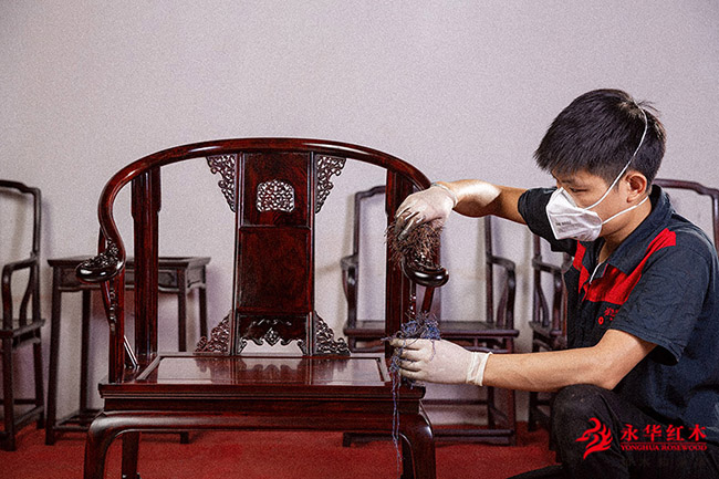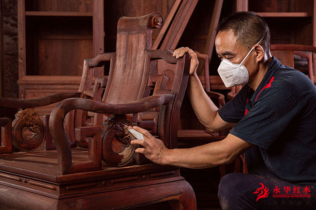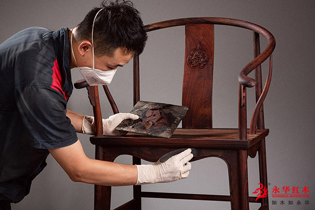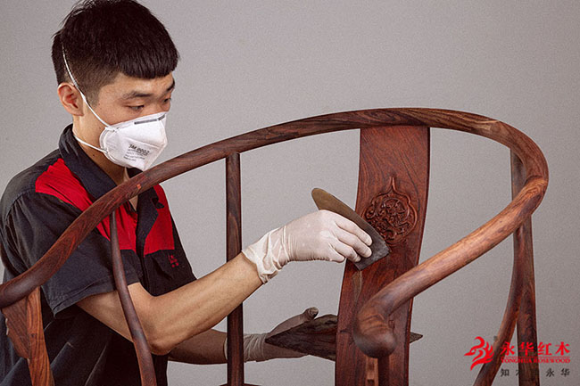 由于生漆对温度、湿度极为挑剔,永华红木严格遵守中国生漆的传统工艺,除了严格控制漆房的温度与湿度外,在“木磨、刮灰、磨灰再刮灰、再磨灰”的环节中,对家具产品反复来回地顺着木纹方向打磨,针对产品不同部位使用不同的工具进行操作,使用不同型号的砂纸对产品进行精细打磨,以保证家具表面光滑透底、平整顺畅,利于在最终“揩漆”的环节中,漆料可以顺着木材组织慢慢深入,使家具成品呈现出温润质感,始终保持着极好的光泽度与细腻度。