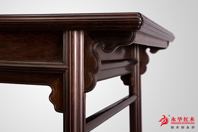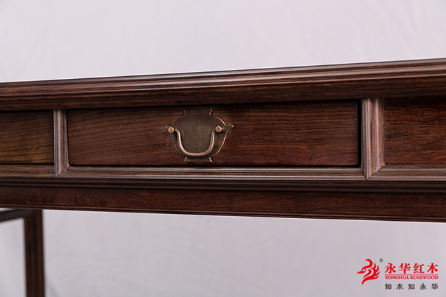 永华红木梅花线书台,由交趾黄檀(大红酸枝)制作而成,台面攒框镶板。做工考究的红木书台,最能突出名贵木材的生动质感。