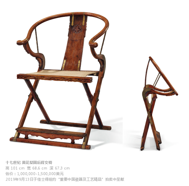 在各种明朝流传至今的家具之中,以圆后背交椅最为罕有。现时已知尚存的明代圆后背交椅只有不足30张,其中一张私人珍藏于2019年9月13日于佳士得纽约“重要中国瓷器及工艺精品”拍卖中呈献。