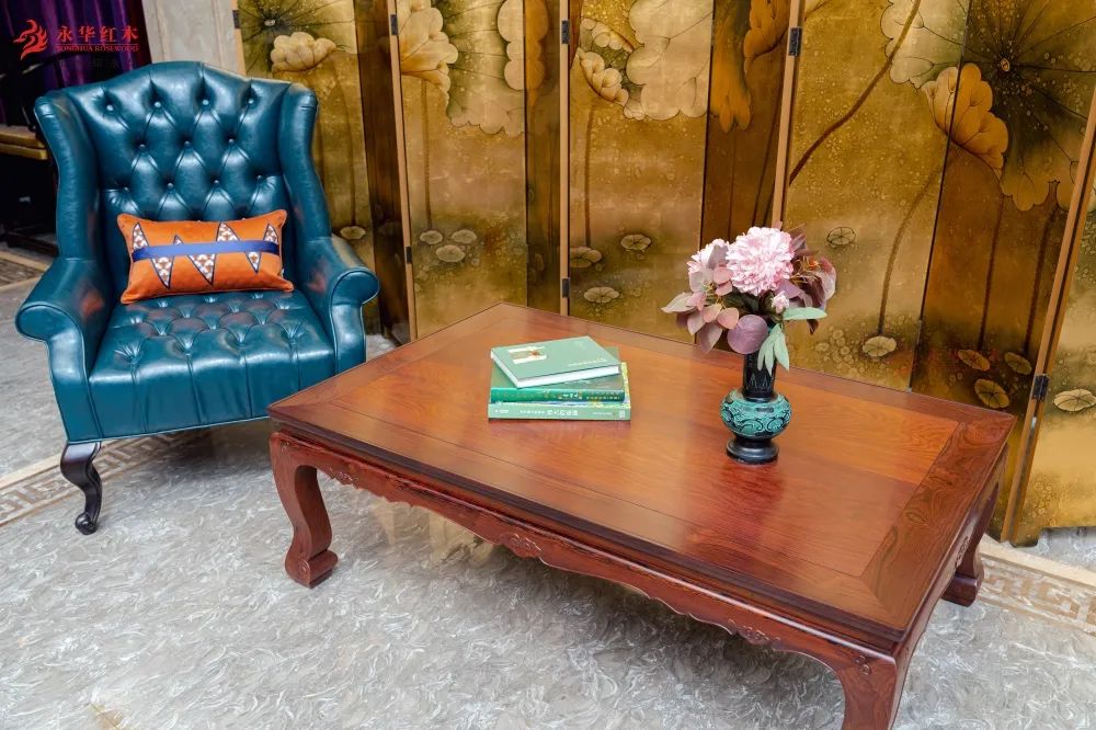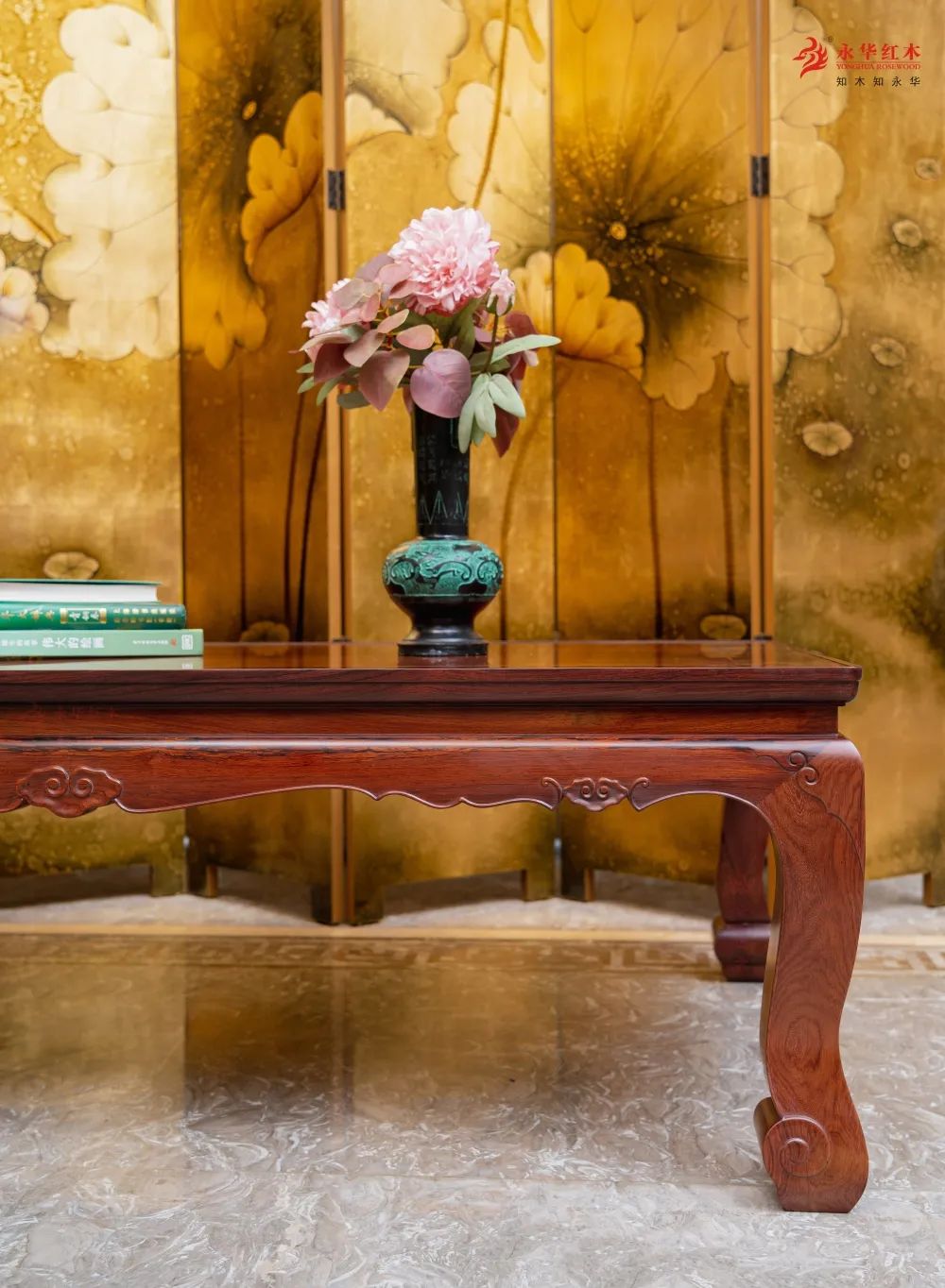 永华家具巴里黄檀云纹三弯腿炕桌复刻于美国加州中国家具博物馆收藏,并收录于王世襄《明式家具萃珍》。一般明式家具如沿牙条和腿足的壸门式轮廓起阳线,大都在正中雕卷草纹,两侧挑出草尖,这样正好顺着阳线生发成章。