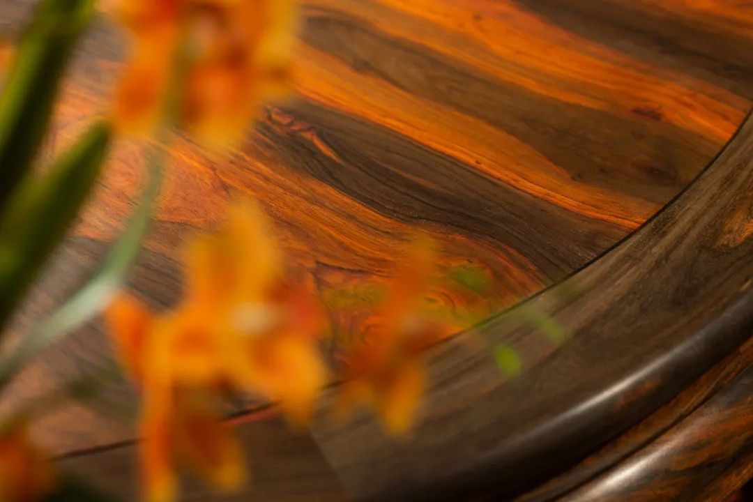 交趾黄檀结构细而密,鬃孔很小,纹理清晰、顺直,有立体感,在强光下仿佛有金色透亮的荧光浮动于表面,及其美丽。