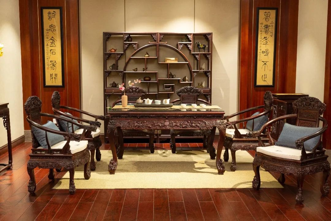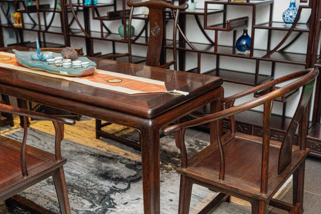 大红酸枝家具的美,既是内在的质之美,也是外在的文之美。永华家具大红酸枝茶室,简约的明式制式家具,以简单朴素为基调,营造一种宁静致远的感觉,浮于器具之上的自然纹理灵动秀美,煮茶品茗,怡然自得。