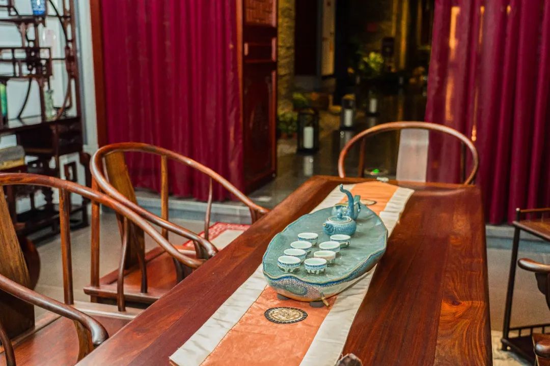 中式茶室,置放一张方中有圆独具东方气质的茶桌,几把经典明式圈椅,世界纷纷扰扰,而这里脱俗淡雅。