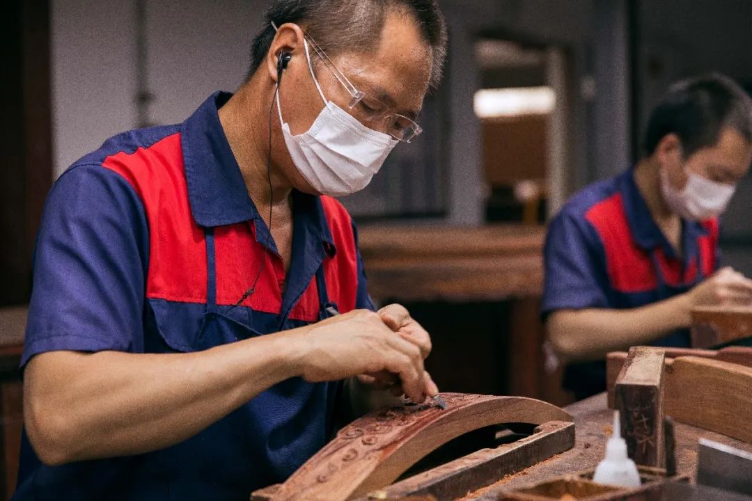 没有一件工艺品是一模一样的,因为每一块原材料都各有特点,根据木材特点进行设计加工出来的才算是一件有灵魂的工艺品。岁月流于指下,永华匠人的刻刀在家具上“妙笔生花”。