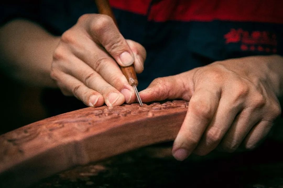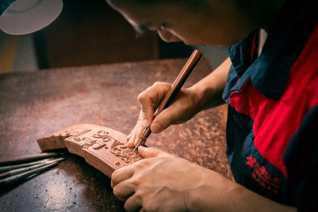 下刀时讲究干净利落,平刀勾勒轮廓,锉刀去除棱角,木头在木匠手中慢慢塑形。不断变化的角度和力度,一厘一毫的精细打磨,诠释着匠人专注与执着的精神。