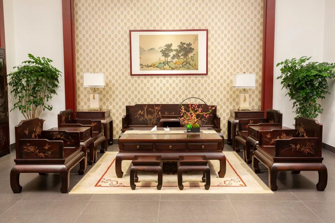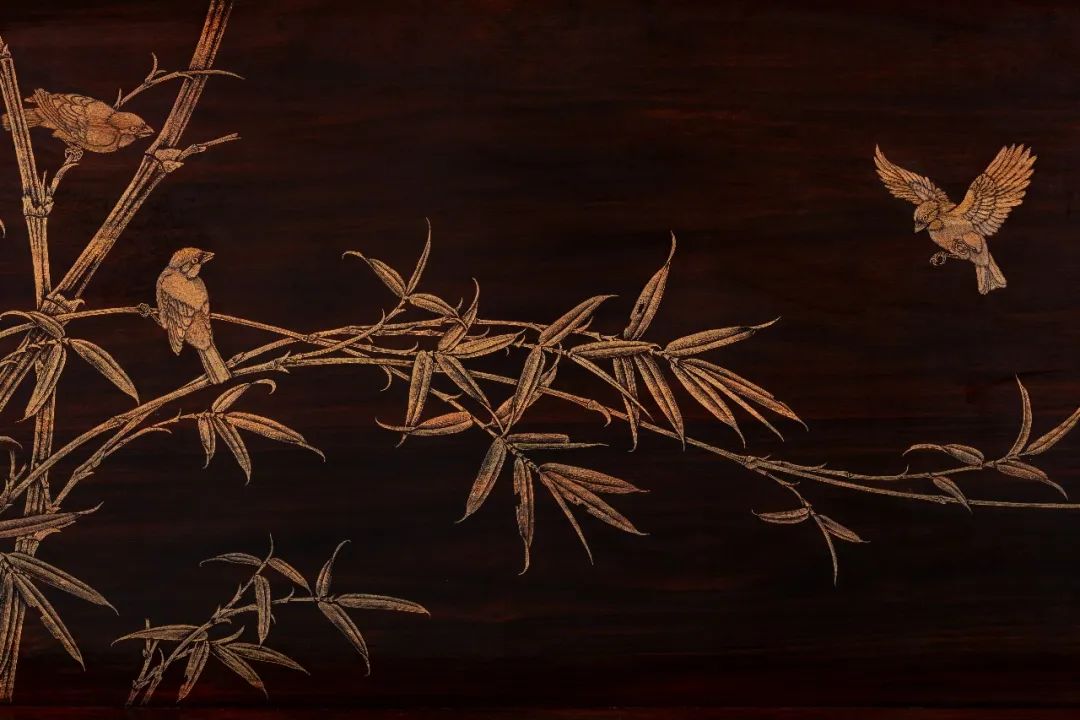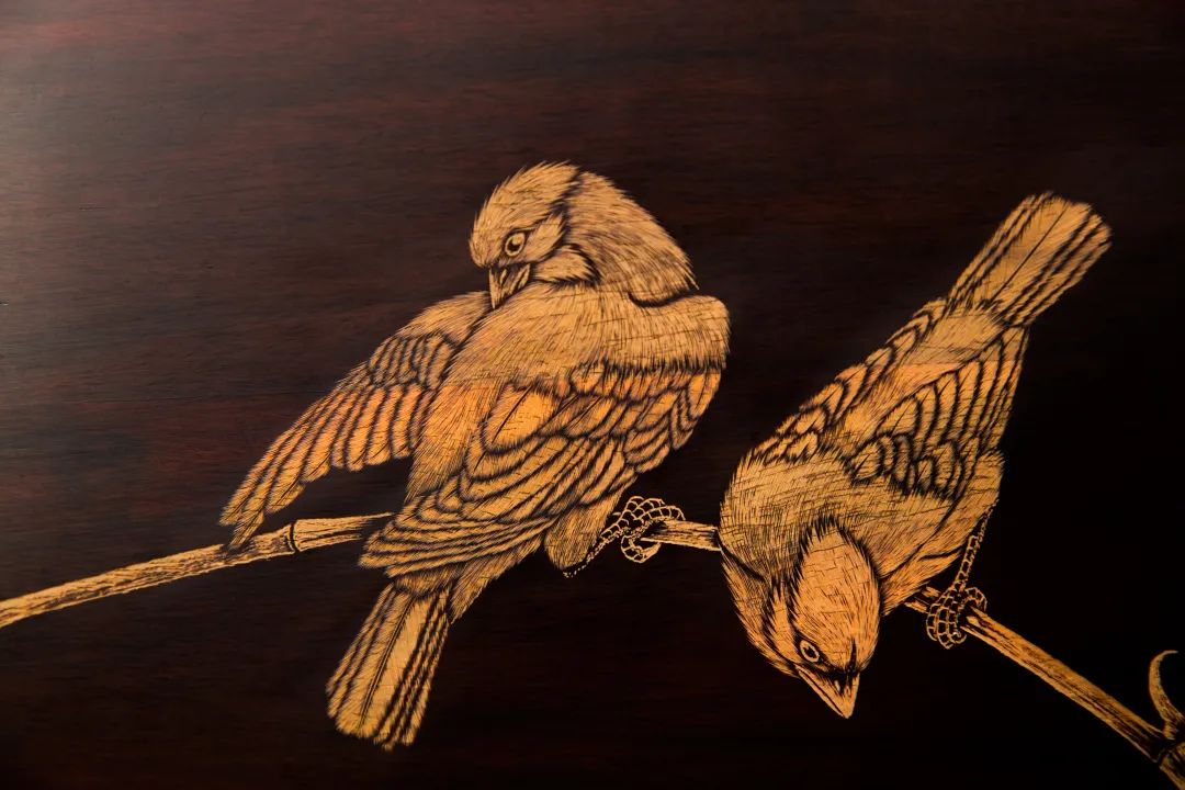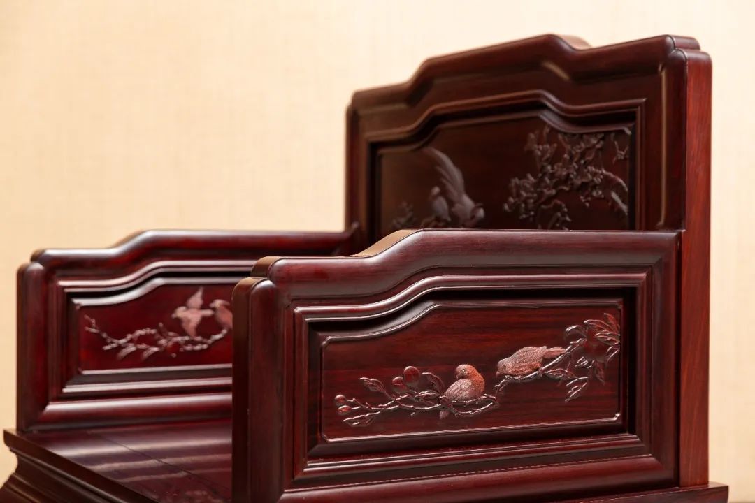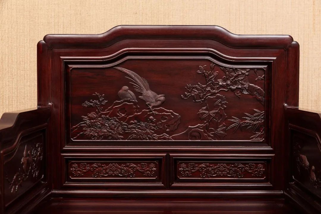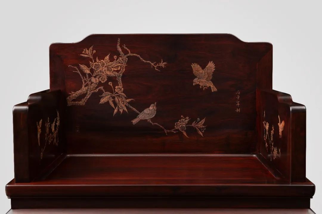 影雕花鸟沙发,有图必有意,有意必吉祥。沙发靠背上有喜鹊雀跃于梅花枝头上,取“喜鹊”与“梅花”的首字,寓意喜上梅梢,以影雕技法,通过深浅虚实的点线变化,将鸟的羽毛,树叶的纹理若影若现地呈现出来。