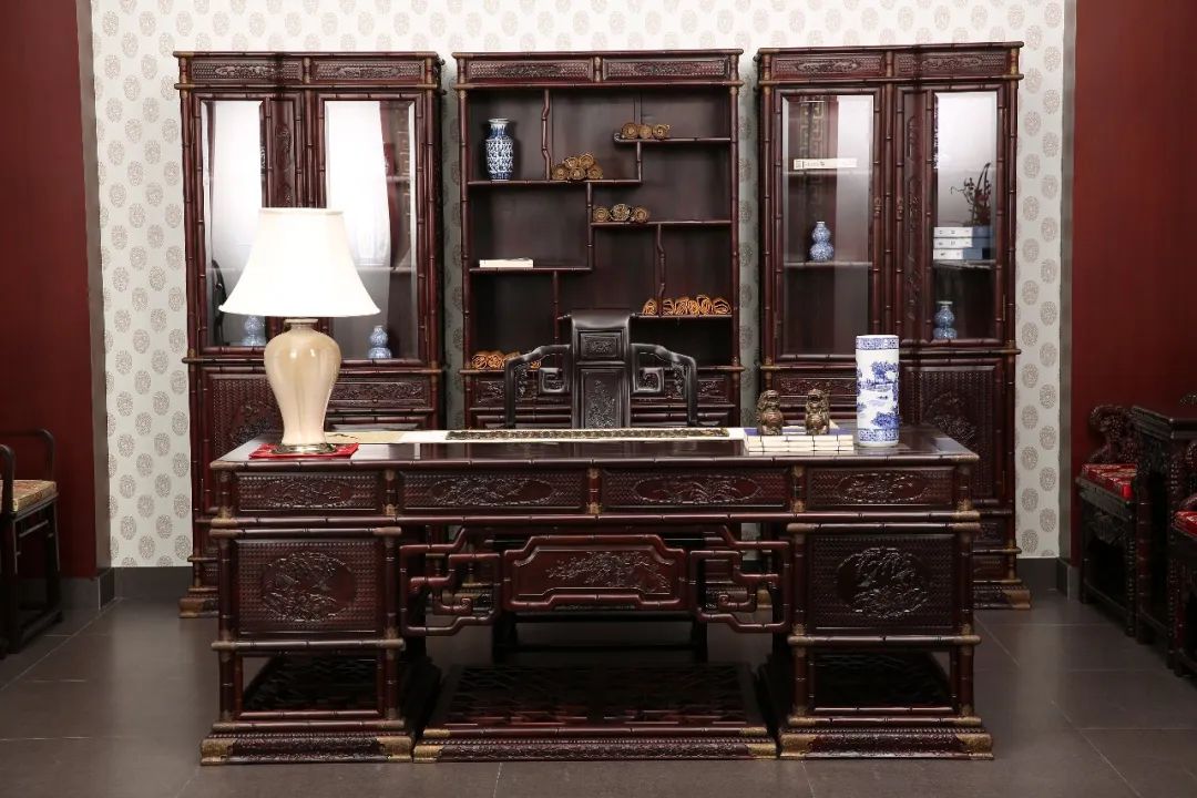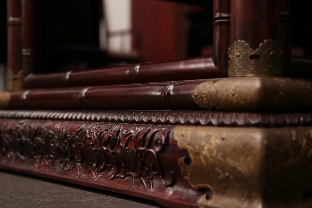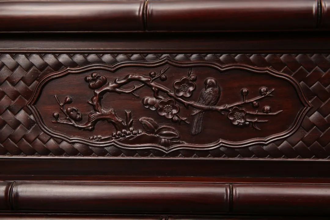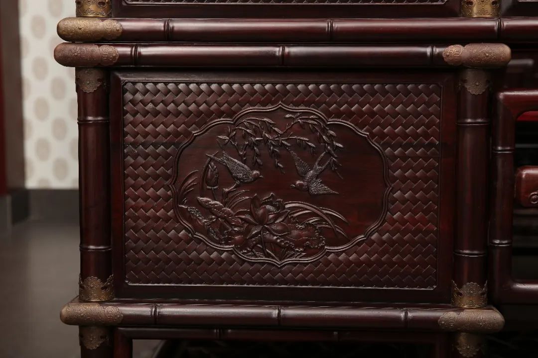 竹节雕花班台,以浮雕技法,将清雅脱俗的竹子,不趋炎势的菊花,一身傲骨的梅花,栩栩如生地雕刻于小叶紫檀上,将有限的内在精神品性,升华为永恒无限之美。