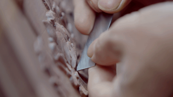 几案桌椅上大气的纹样、优美的装饰、硬朗清晰,都离不开“木”,更离不开匠人手中的刮刀。精细刮磨后,质朴无华的木,成就华美与优雅。古老技艺的荣光,在今天的匠人手中延续。