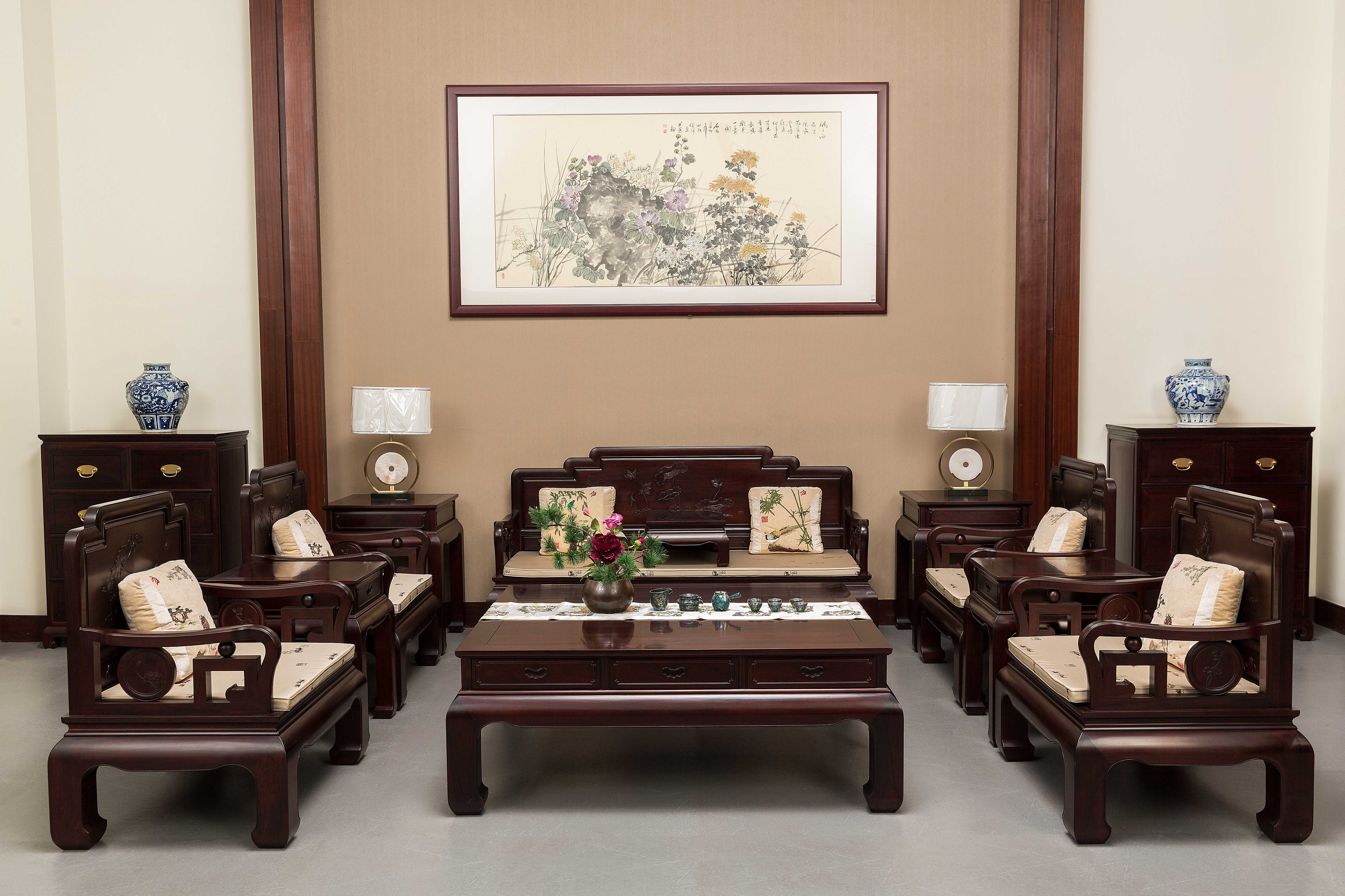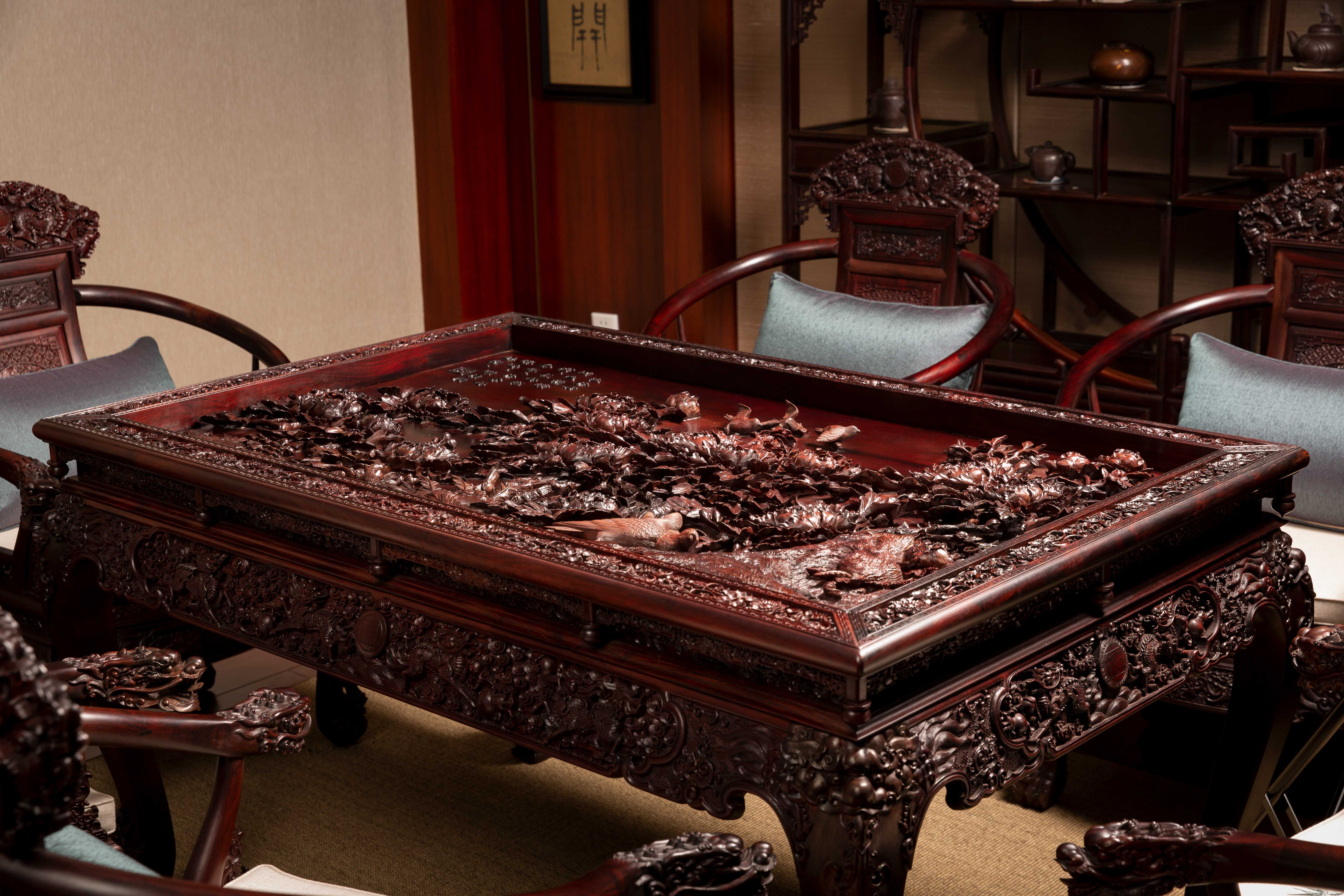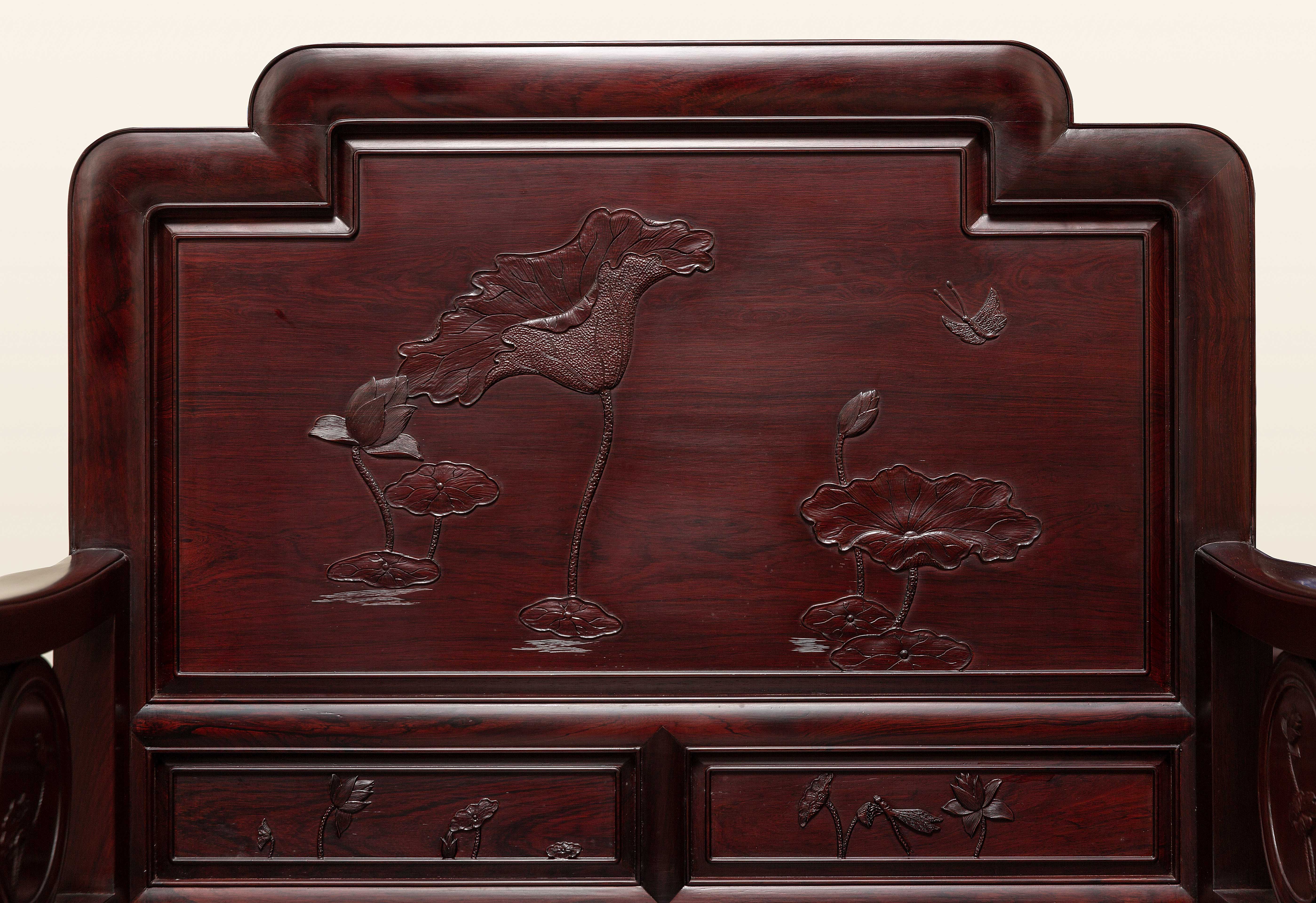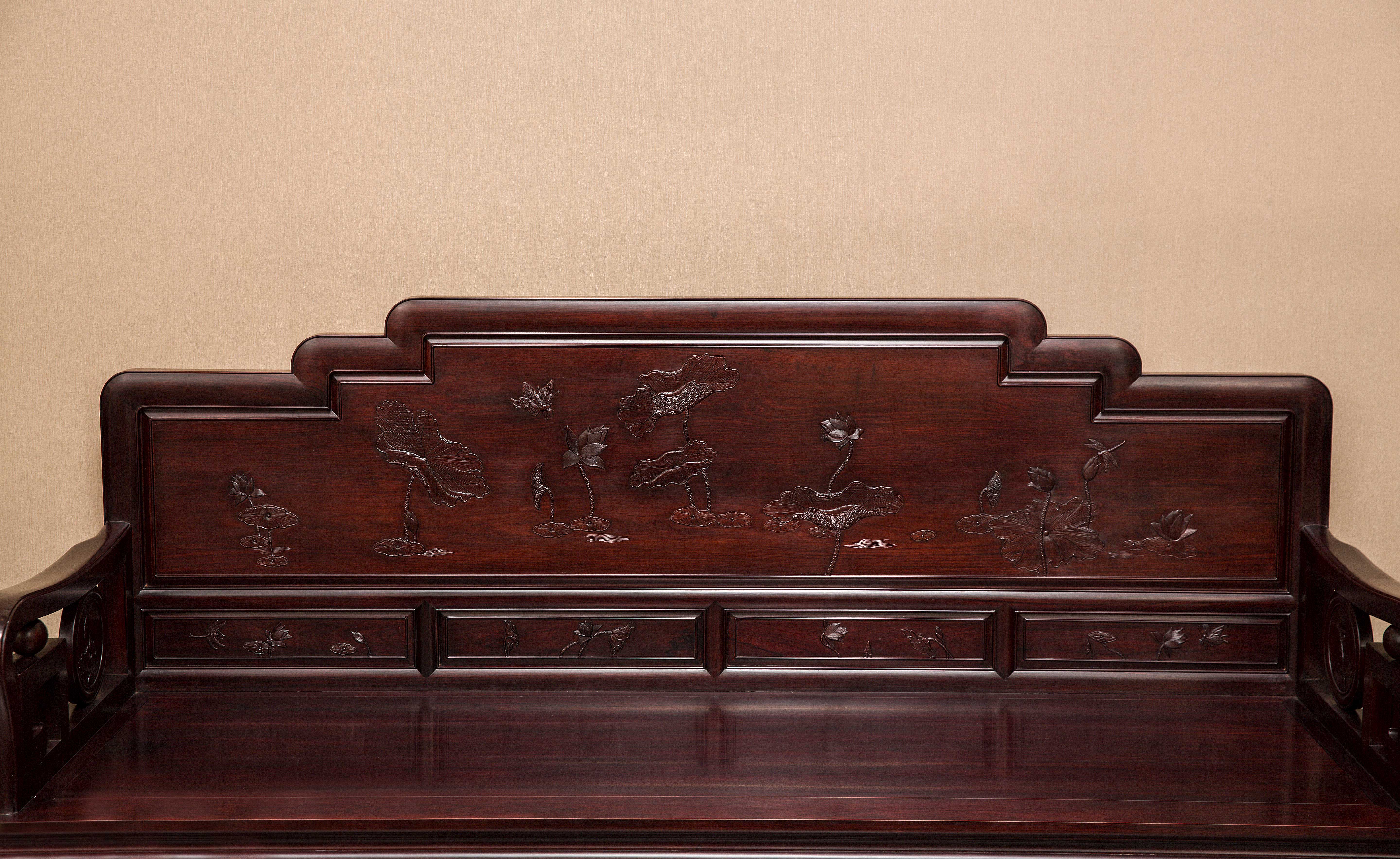 国礼沙发上千姿百态的荷花,有含苞待放,有亭亭玉立,它们连成一片,形成一副生动画作。明明是自然之物,却汇聚匠人慧心,古之技艺,尽显红木本色。