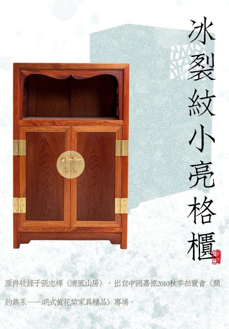 是亮格款式、是镂空雕刻的海棠纹门板、是冰绽纹的侧板,于文人工匠而言,柜子是物之载体,也是居者气质的体现。