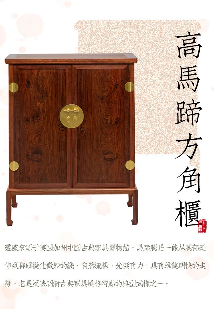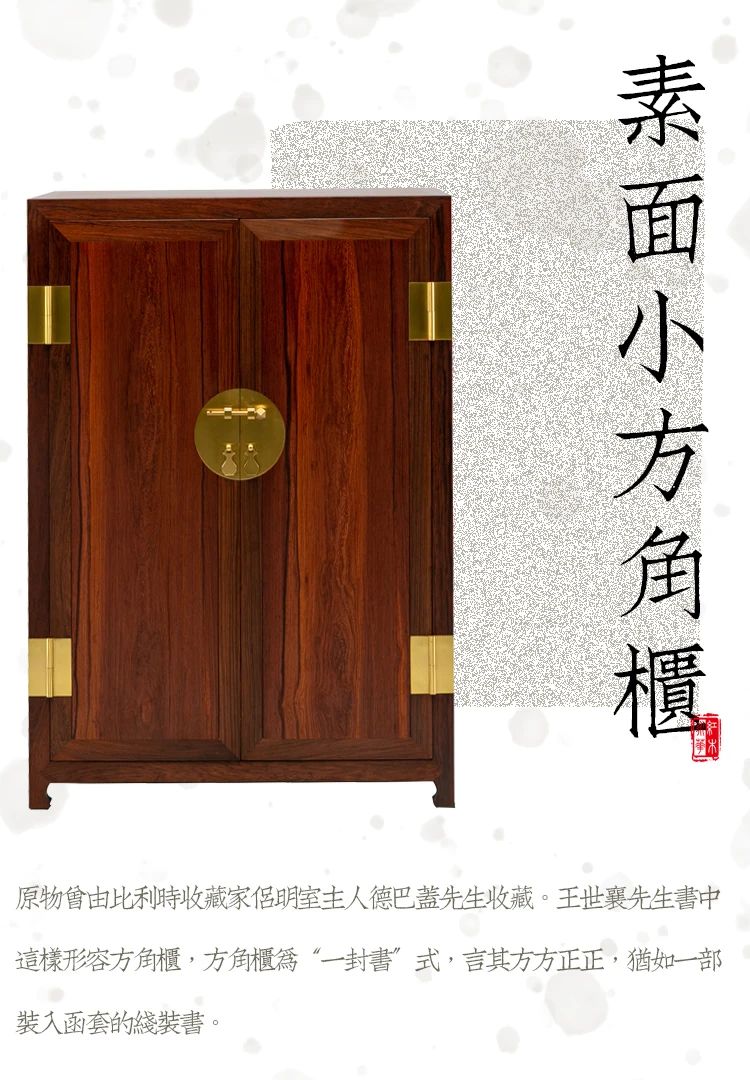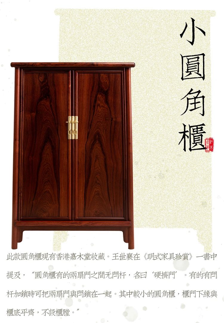小圆角柜又称小木轴门柜,永华家具的小圆角柜两门、侧板、层板和顶板均为独板,四足外圆内方、下舒上敛,在予人精致优雅稳固的同时柜门的重心集于柜体中心,使得柜门打开后可以自动闭合,柜帽及柜门边抹混面压边线,通体线条简洁洗练,线性变化一气呵成。