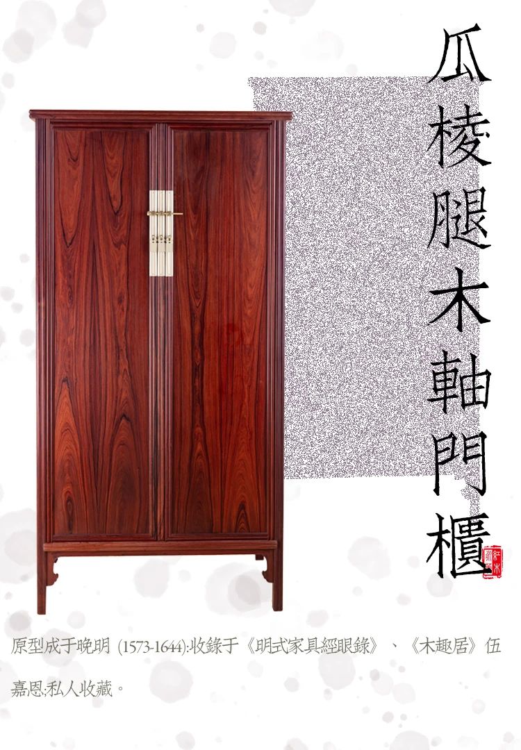 此柜特色在于,组成柜体表面的横竖材均为瓜棱形,不仅工艺难度高,且线条流畅,十分美观。整器呈A字形,有侧脚,四根瓜棱形腿足纳入柜顶边框。活动式门杆两旁的柜门,以标准格角榫攒边打槽装独板,门框外侧两头伸出门轴,纳入柜帽与门下前腿足间底长的臼窝,柜门板心对开,花纹对称,背面装四根穿带;柜内有活动屉板一层置于柜帮穿带上,中央一层装两具抽屉,带铜拉手;门下底枨之下安起线牙条格角接合叶形牙头,两端嵌入柜脚,上方齐头碰底枨;柜体侧面亦安类似牙子,背面亦安牙子但不起线;柜门门框、柜帮边枨、门杆和门下底枨皆起双混面并压线。整体造型典雅,比例匀称,工艺考究,处处体现了明式家具的风采。