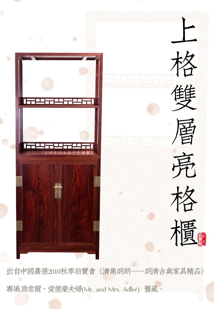 柜子上格不装后背板,亮格全敞,有利于四面观赏陈放的条道具。柜顶为平镶,方便放置盆裁之类的小景。亮格除正面外,三面设券口,这样做是为了