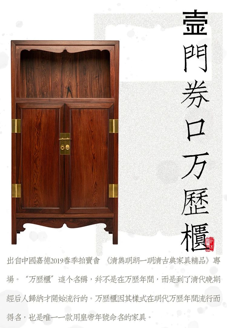 此万历柜整器格调古雅清逸,体例适中。此柜巴里黄檀制,色泽盈润,纹理清晰美观。亮格有后背板,正面安壸门式券口,沿边起阳线,中央出尖,弧线刚劲有力,又不失优美。两侧安光素圈口。柜门独板,一木对剖,纹理对称,细腻文雅。门上镶长方形面叶、合页。门内设抽屉两具,可存放小件文玩。柜腿间三面安壸门式牙板,沿边阳线历练明快,壸门轮廓与亮格的券口呼应,设计颇用匠心。