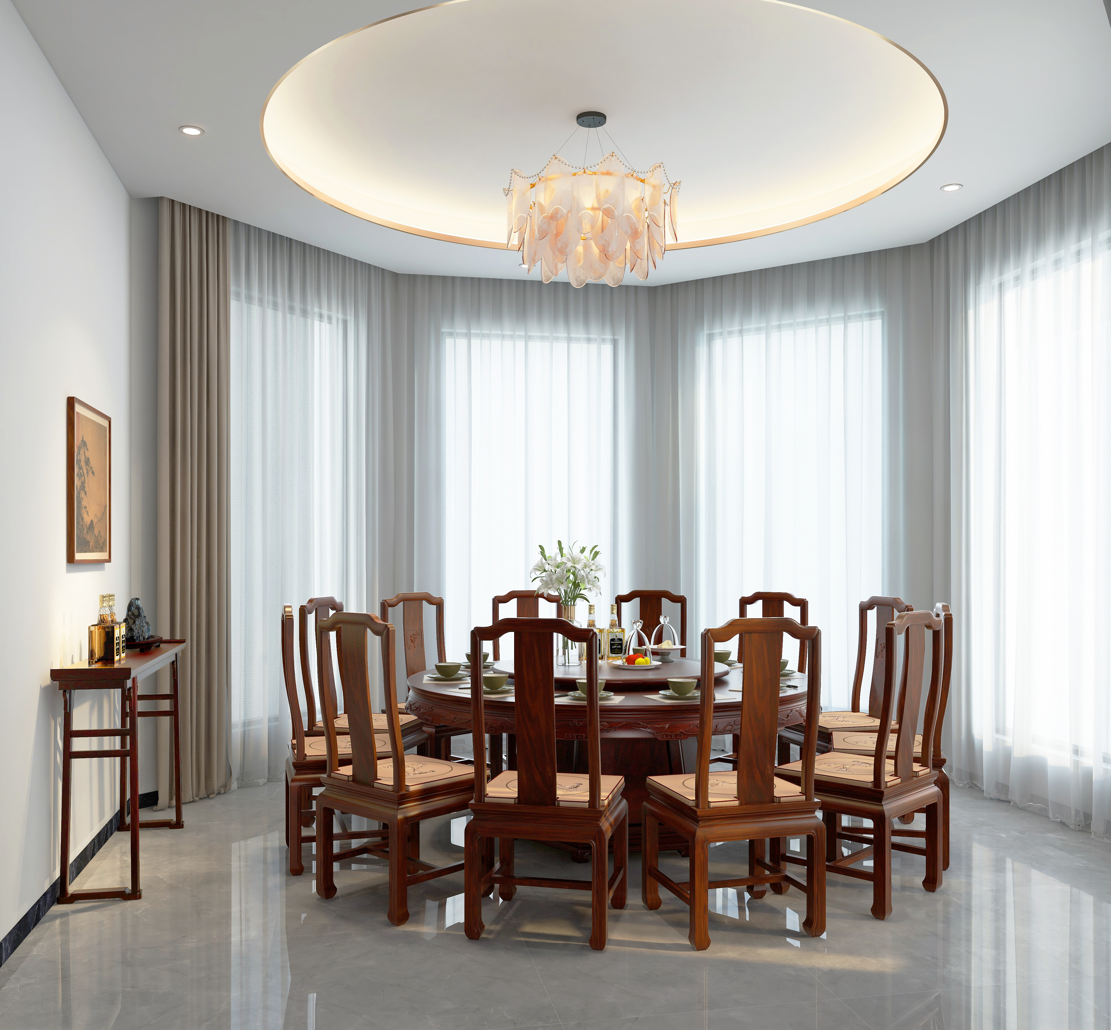 国色天香圆台与圆形吊顶相呼应,自然光透过纱帘柔和地洒入,与灯光交织,营造出舒适宜人的用餐环境。