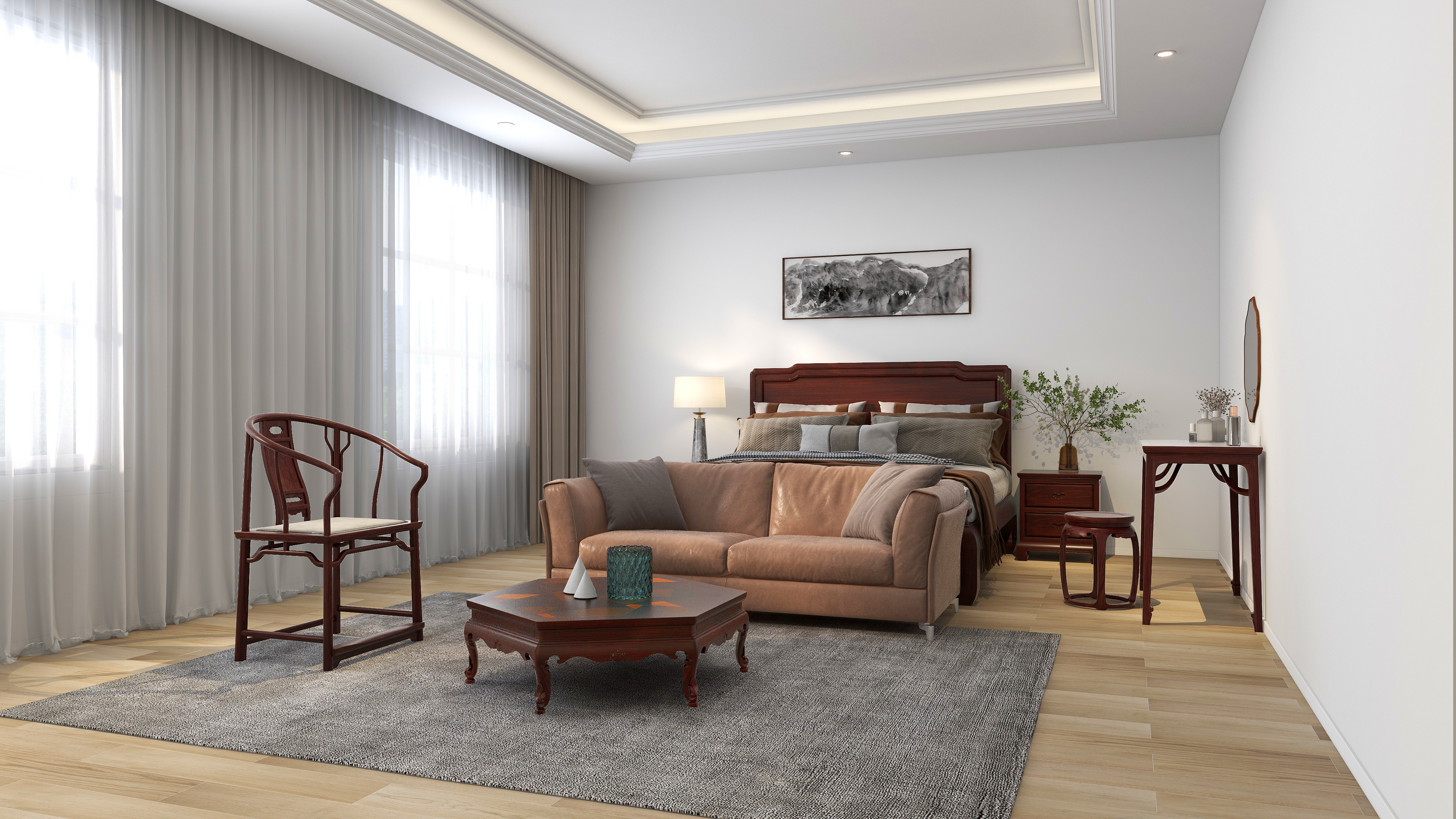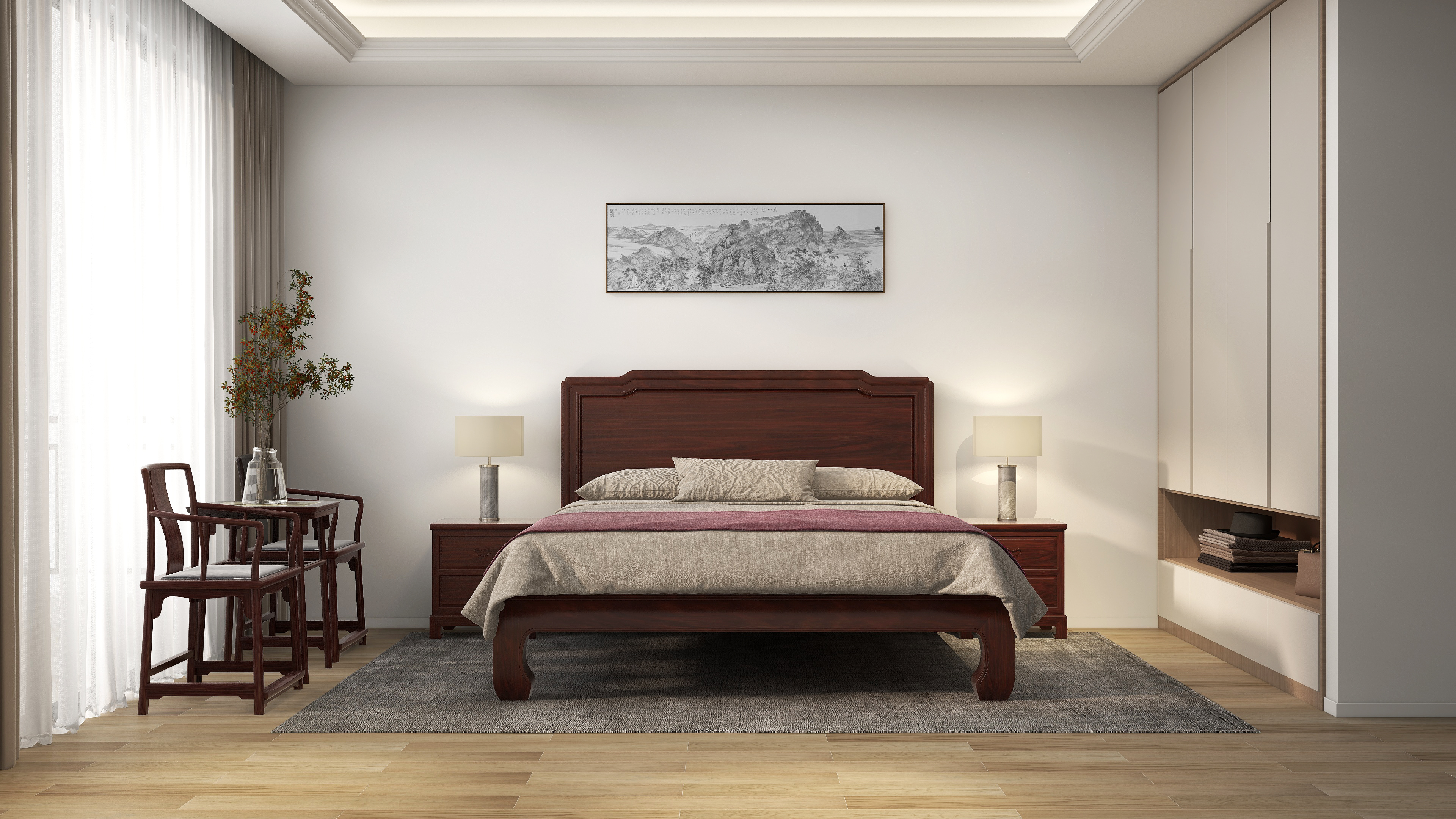红木大床居于中央,床头造型简约大气,纹理清晰,散发着古朴的质感。窗边摆放着一套中式桌椅,闲暇时可在此品茶、阅读。桌上的花瓶里插着几支绿植,为房间带来生机与活力。
