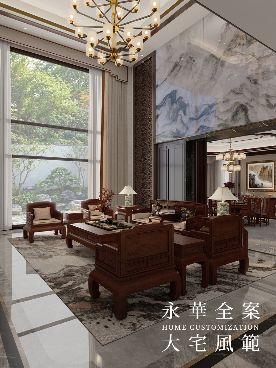作为空间序章,会客厅展现规制美学。大红酸枝木搭配大理石地面与背景墙,形成鲜明且柔和的视觉对比。大理石灰白纹理如水墨氤氲,透过自然光的漫洒,空间宛若一幅静谧中带着生机的画卷。布局采取对称围合: 国色天香沙发对望于中央茶几,营造沉稳却不失亲和的交流格局,因其线条简练、靠背雕花细腻,搭配浅米色靠枕,恰到好处地点缀出沉静气质。