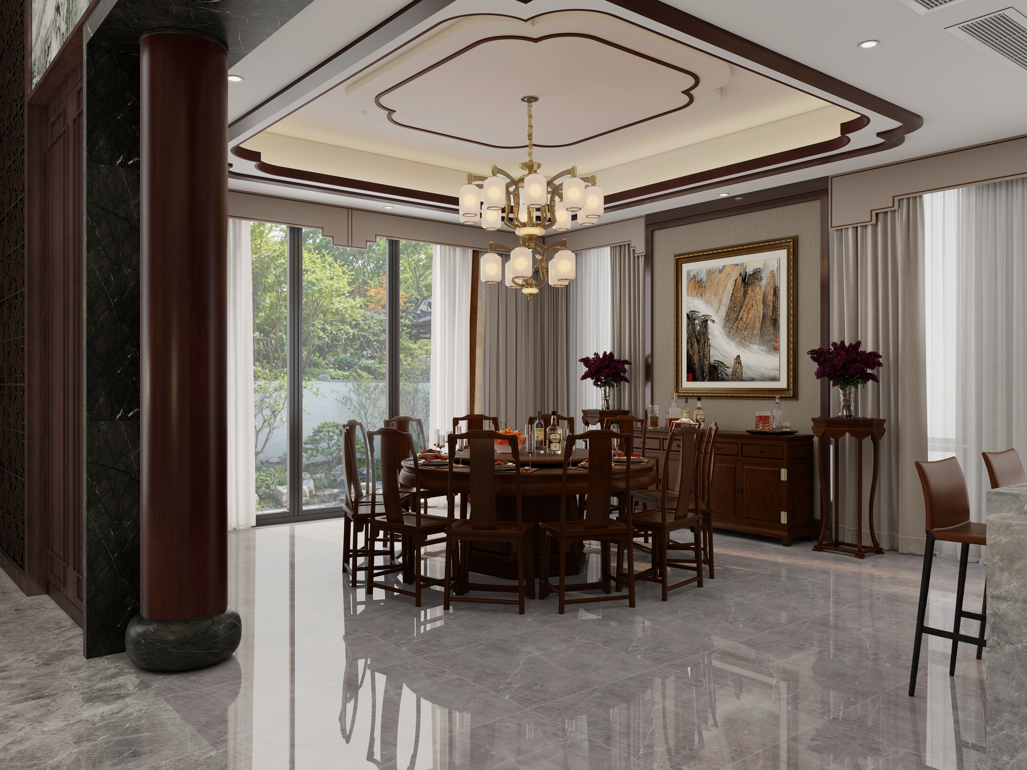 多功能厅兼具会客、品酒,精致的酒柜嵌入墙体,展示藏酒与待客礼器。餐区延续风格,格局合理、氛围统一。通过家具高度差、材质细节形成清晰层次,满足社交的复合需求,层层递进,功能分区清晰,悠然中尽显空间礼序。