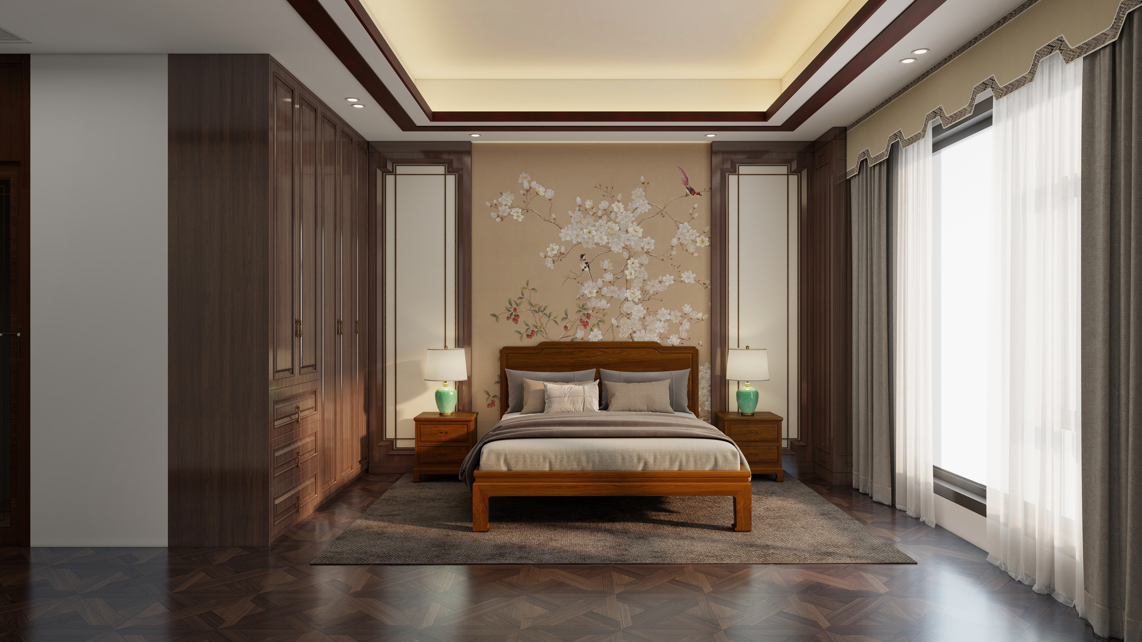 主卧与次卧均选用深色木地板与米色墙布,搭配 月上疏影大床,设计上摈弃繁复:深色木地板与墙布构成沉着基础,床头背景墙以花鸟壁画轻点,营造若隐若现的传统韵味。入夜后依靠床上,仰头望去,简洁、高雅、沉静,神奇的安抚着稍稍躁动的心灵。