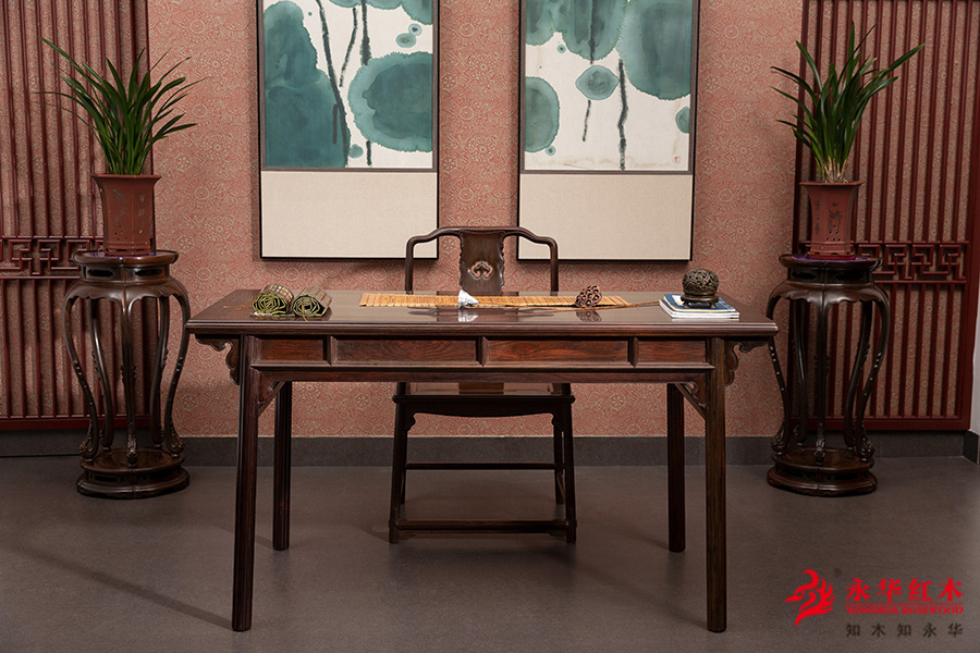 书台整体造型简约素洁,端庄之余又散发出典雅空灵的文人气质,搭配同工艺的南官帽椅,置于书房,雅致气息扑面而来,再现东方美学经典。