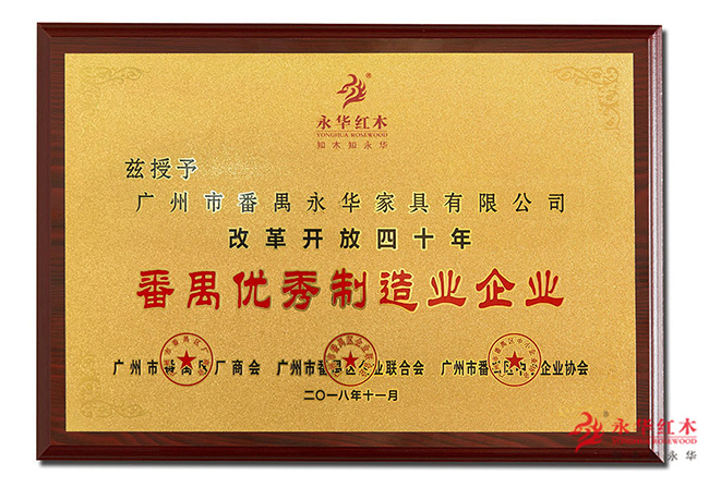 永华红木荣获“改革开放40年番禺优秀制造业企业”称号