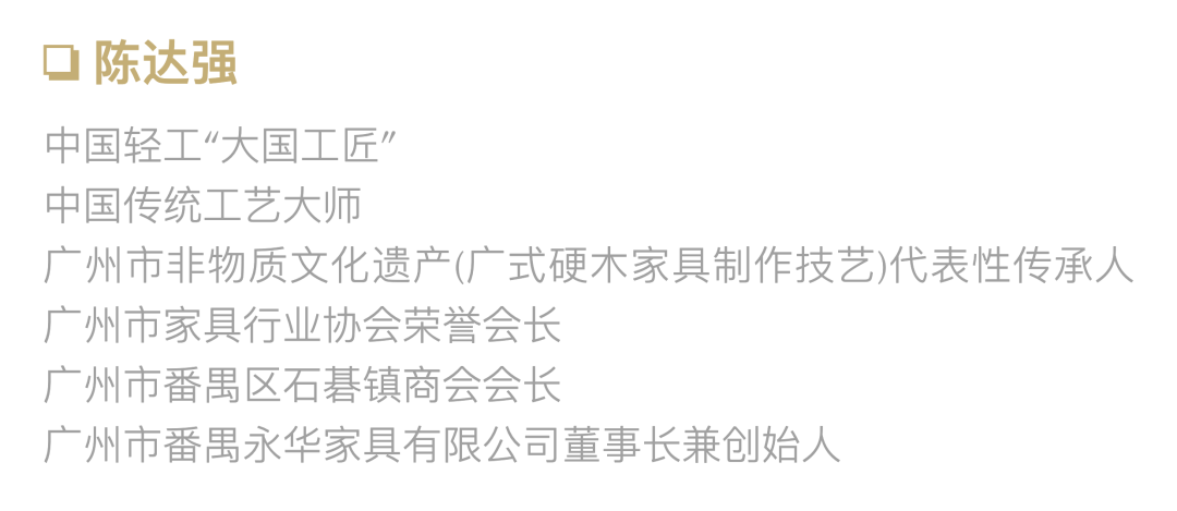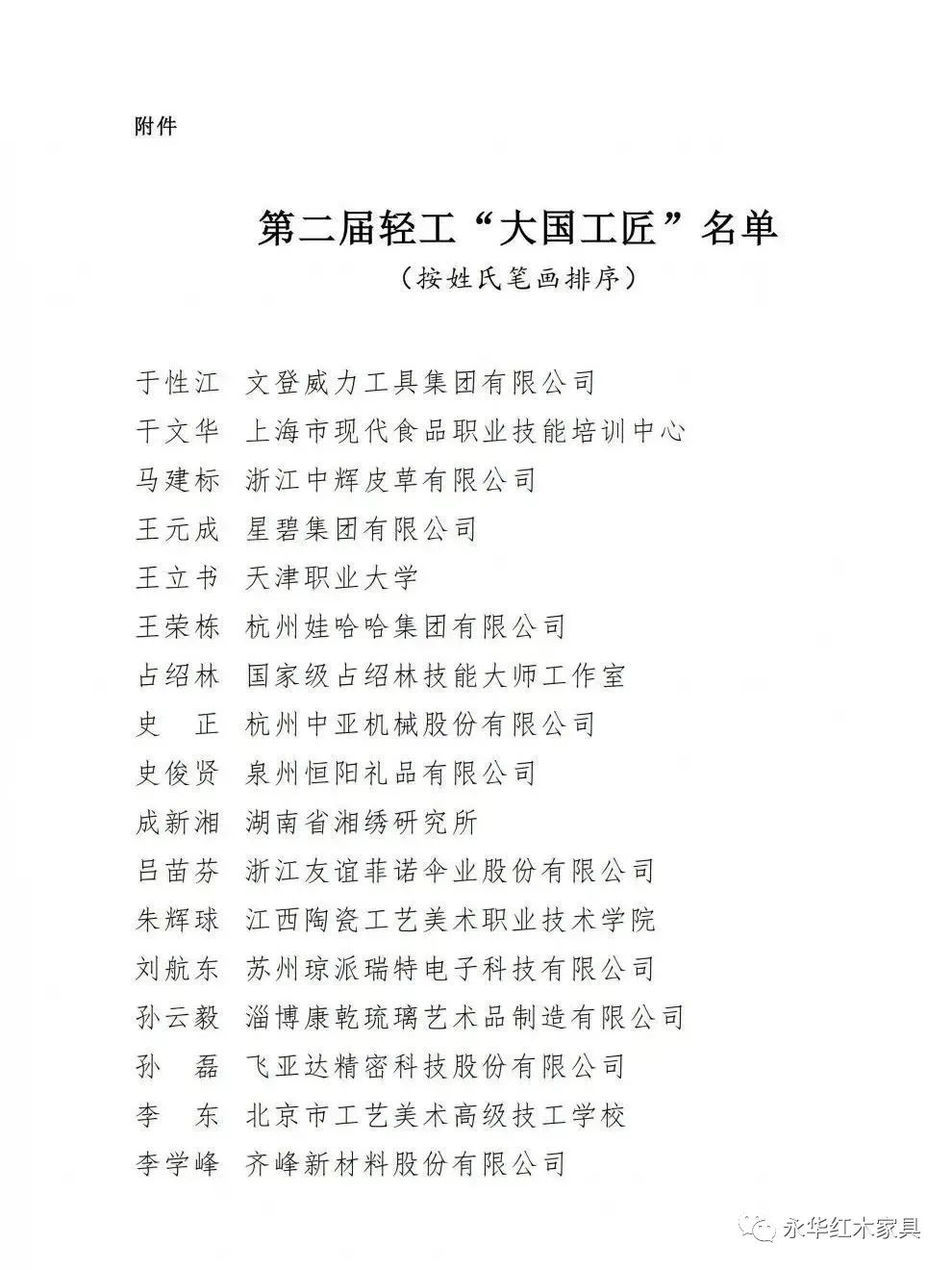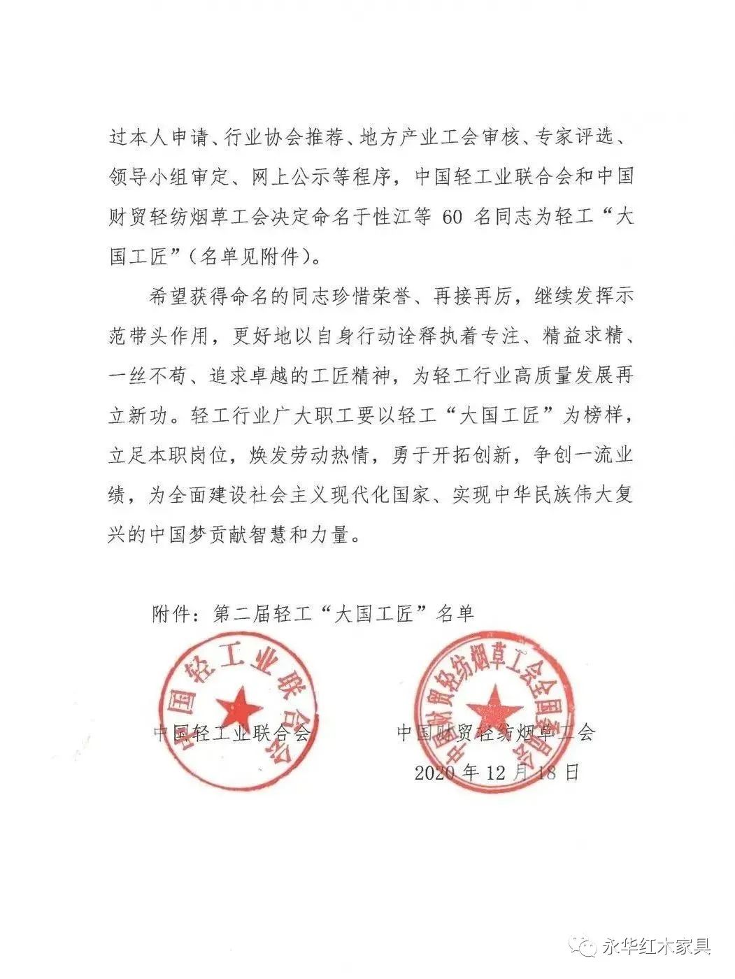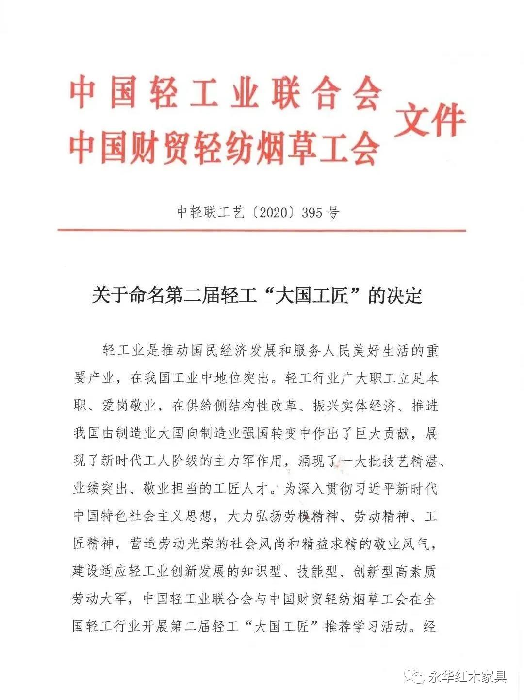 【喜讯】2020年12月18日,由中国轻工业联合会与中国财贸轻纺烟草工会举办的第二届轻工“大国工匠”名单揭晓,全国共有60名行业佼佼者被命名为轻工“大国工匠”,其中全国家具行业5人入选,永华红木董事长陈达强作为传统家具行业工匠代表之一,成功入选,荣获第二届轻工“大国工匠”荣誉称号!