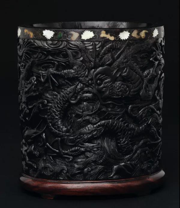 备注:此笔筒器表满浮雕鱼龙海兽图像。二龙一为海水龙,一为腾云龙,双龙盘旋,气势震慑人心。为王世襄(1914-2009)旧藏。王世襄根据浮雕二龙的表现类似永、宣瓷器上的龙纹,以及其它动物的奇古之貌,认为此笔筒绝非晚明所能有;又将其与朱守城墓出土的紫檀螭纹扁壶相比,认为其时代风格显然早于万历,其年代可能早至十五世纪中叶。