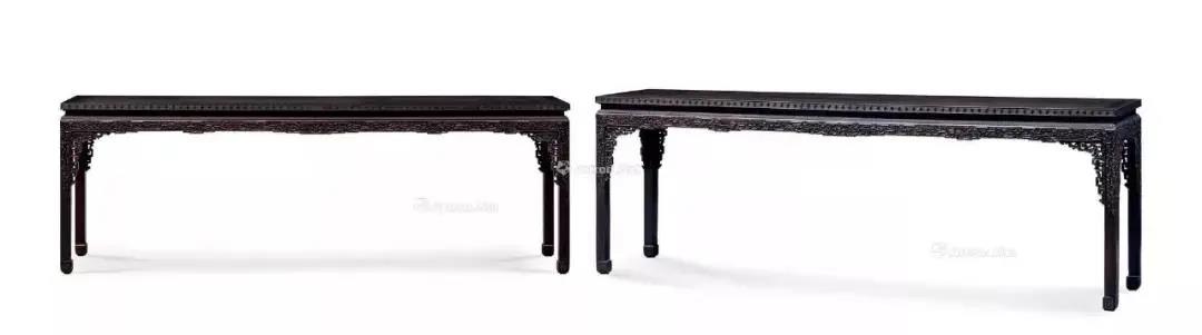 此对御制紫檀雕兽面龙纹条桌的长度为两米七,长度应为目前所见成对传世桌案中的最大者。相似的例子可见于2006 年北京出版的《故宫博物馆藏明清宫廷家具大观·上》图229、231,在养心殿后殿东暖阁皇帝的寝室中,可见一张紫檀雕花条桌,与本桌型制近似。另在2002 年出版的《明清家具·下》图版 263中,同样可见一张类似的紫檀条桌,靠墙陈设于北京故宫翠云馆西梢间西墙。