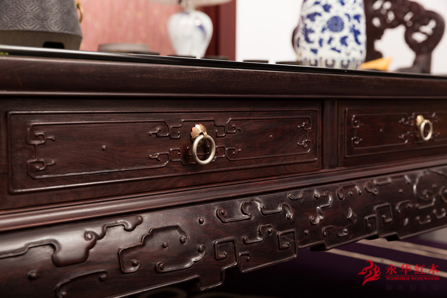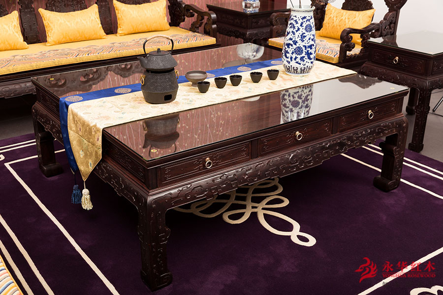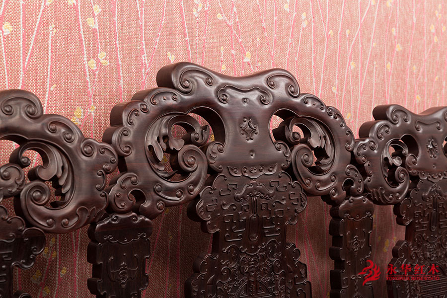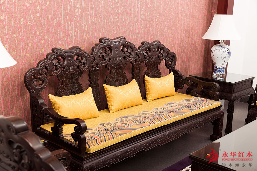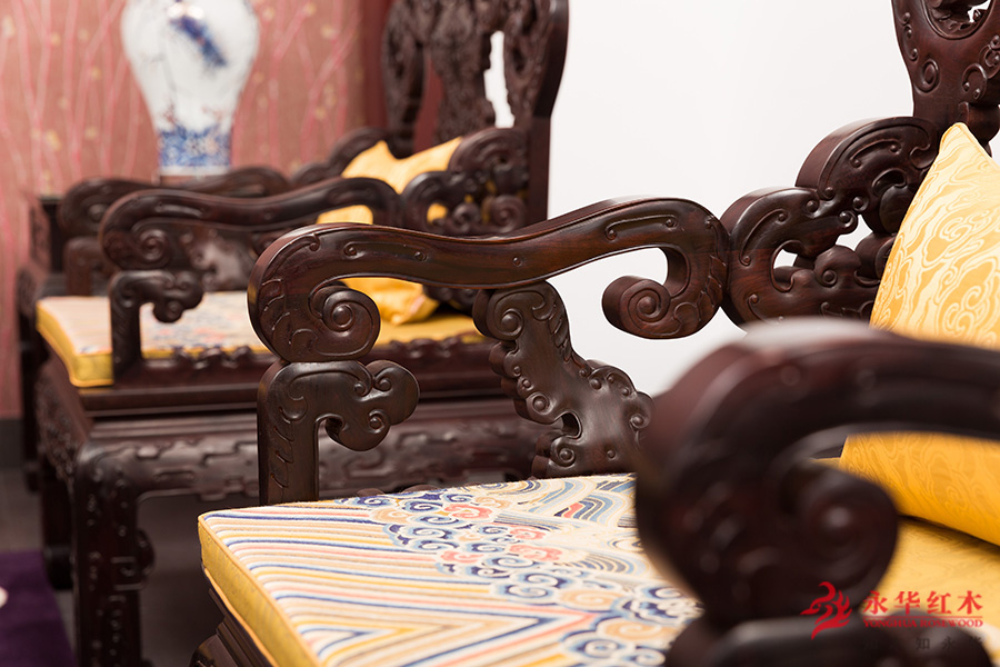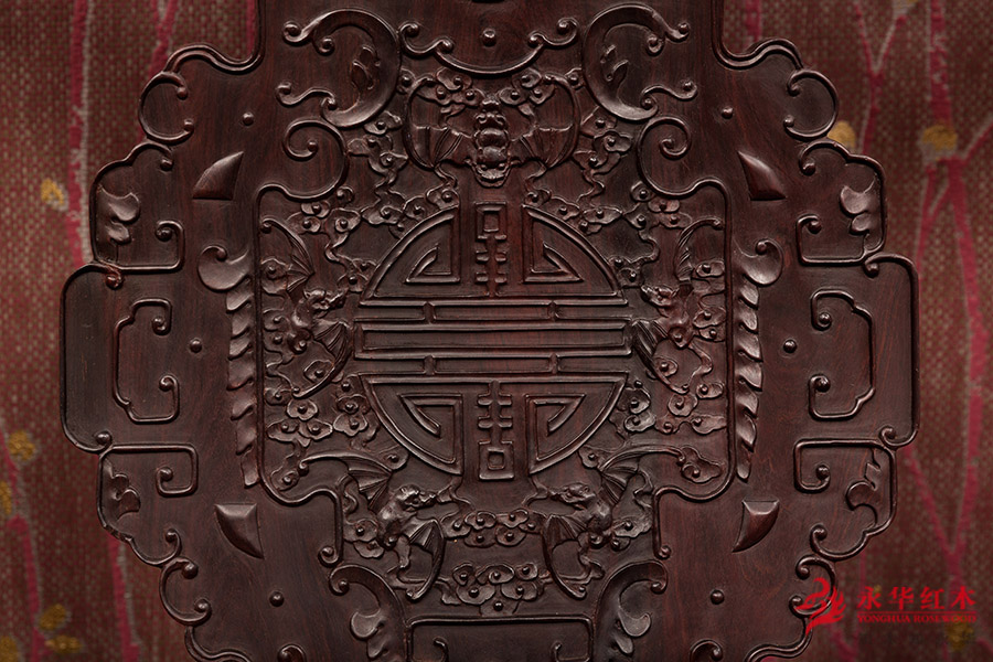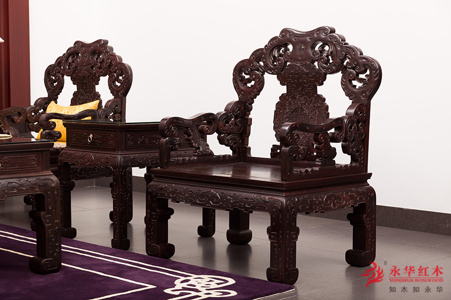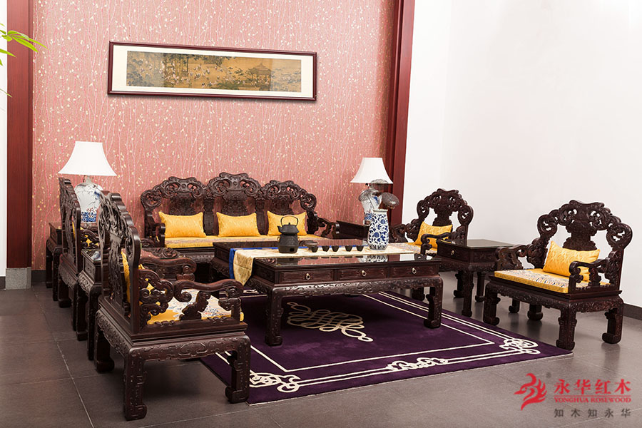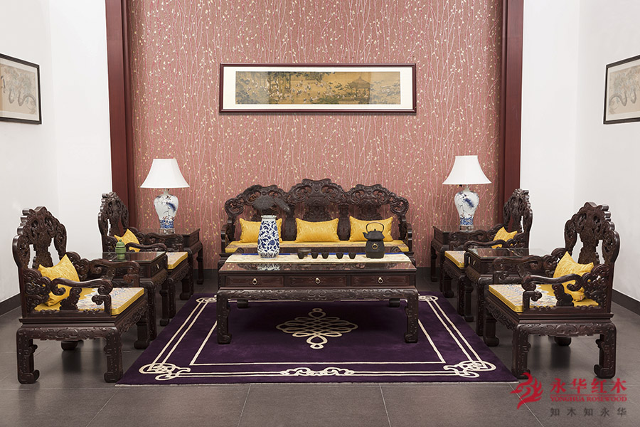 产品详情: 永华红木此套福鼠寿字沙发由小叶紫檀制成。椅面攒框镶板,高出头搭脑,镂雕卷草纹,靠背嵌板芯,浮雕蝙蝠纹、灵芝纹,中间浮雕五福捧寿,周边浮雕福鼠吊金钱纹。扶手端如意纹,面下束腰,回纹足。此套福鼠寿字沙发用料硕大,装饰华美,风格突出,穷工极巧,尽显富丽堂皇、雍容华贵。