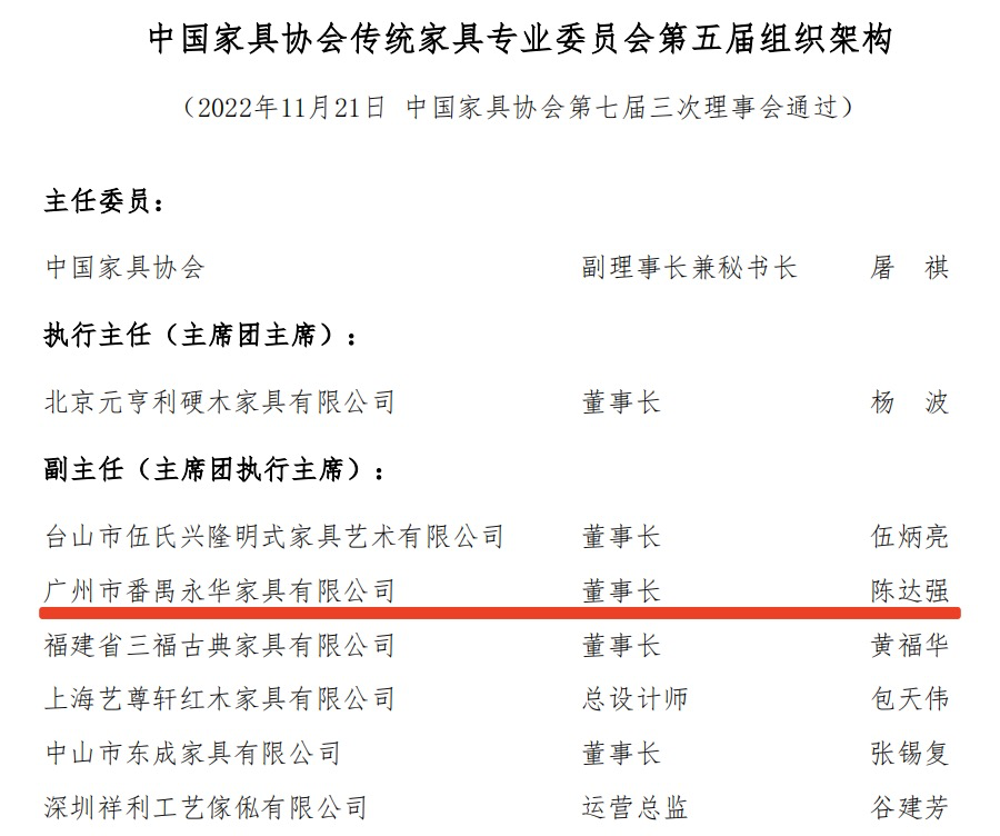 2022年,永华家具董事长陈达强当选中国家具协会传统家具专业委员会主席团执行主席,并表示永华家具将勇于担当,紧抓后疫情时期机遇,在危机中育新机,于变局中开新局,以创新理念助力企业转型升级,促进行业平稳有序发展。