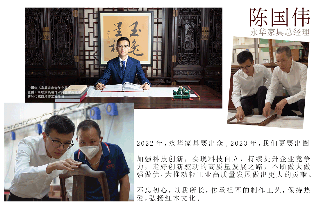 2022年,永华家具坚持企业社会责任、打造高品质收藏级古典家具,收获坚实口碑,今后也将持续发力,以专业技术,工匠精神,传承弘扬非遗文化。2023年,我们再启新章!
